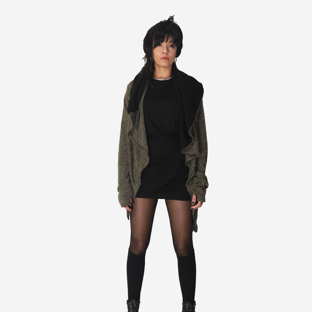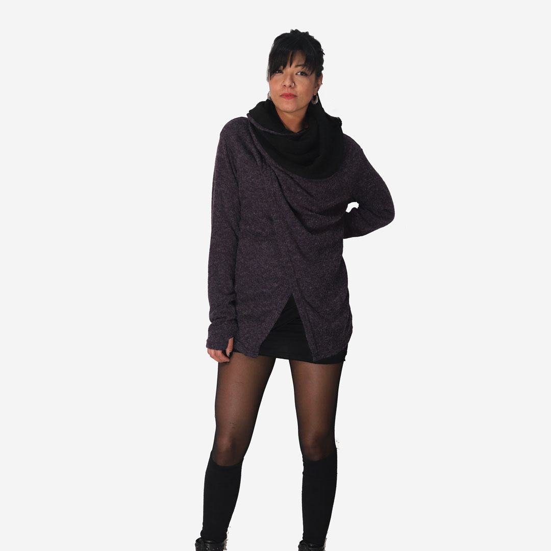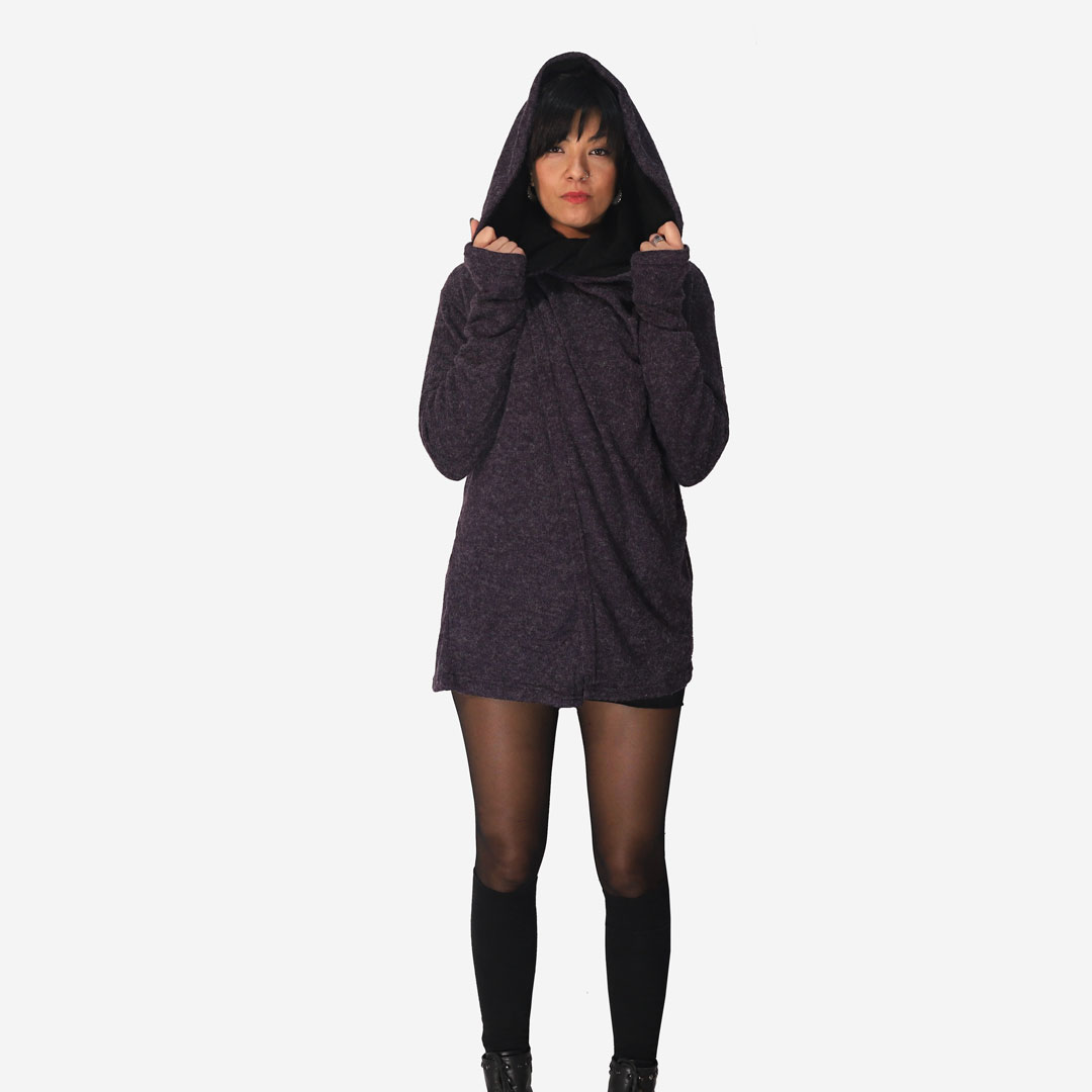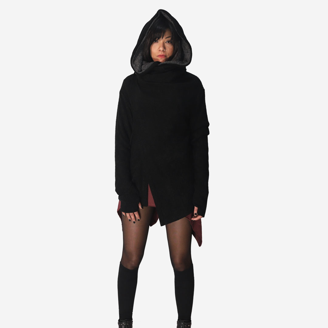 Cardigan mantella corta bicolore, taglia unica ,con ampio collo in tessuto doppiato che diventa un comodo cappuccio, fori per i pollici all’estremitร della manica. Si chiude con 2 bottoni, uno su ogni spalla, il primo all’interno e l’altro all’esterno