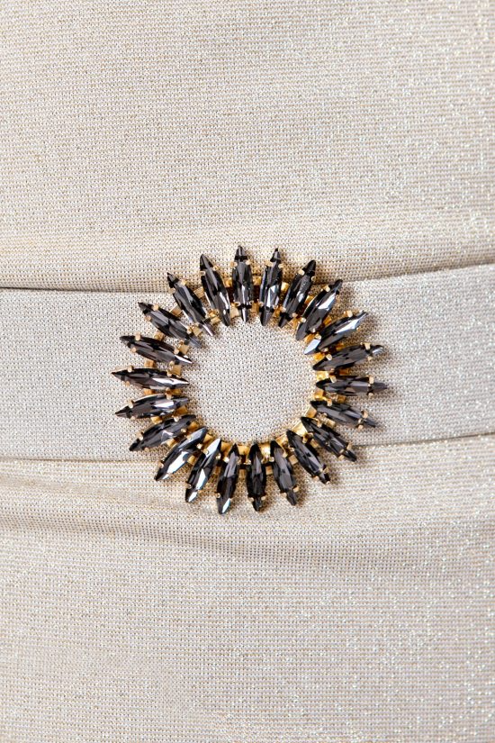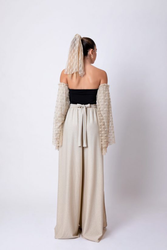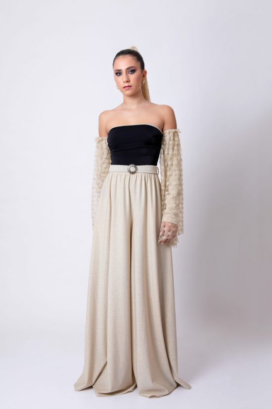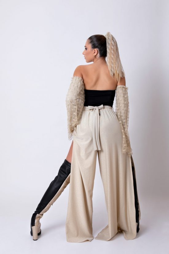 Pantalone palazzo molto ampio con spacchi, in maglina oro, con cintura in vita con fibbia gioiello