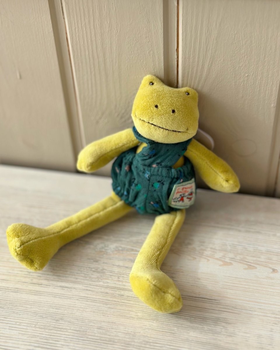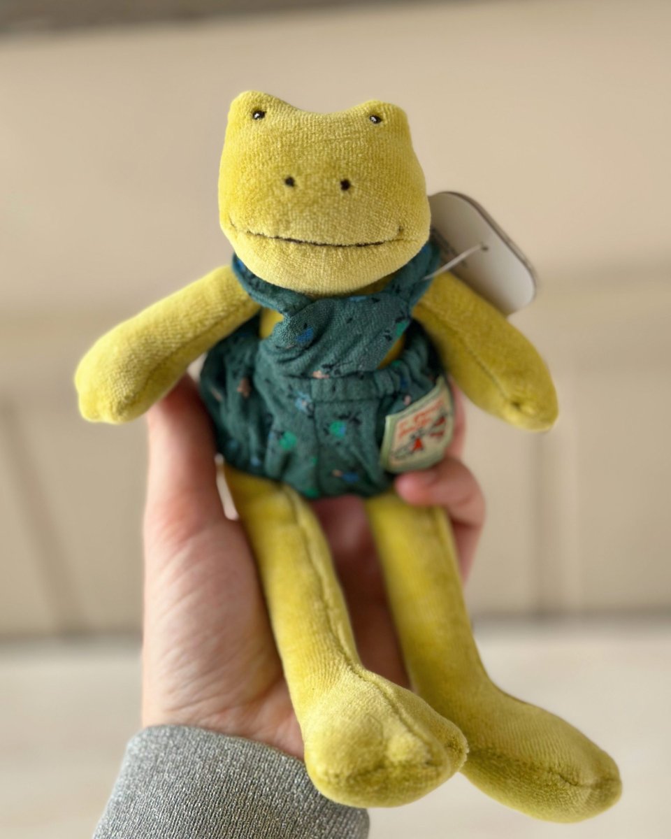 Pupazzo Perlette la rana in miniatura e realizzato in velluto, vestita con una salopette a fiori, invita a condividere momenti teneri e coccolosi con i più piccoli.