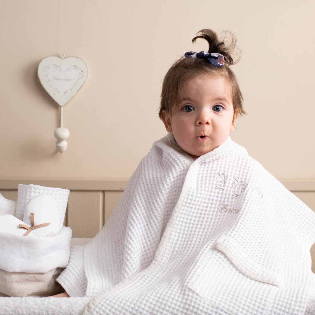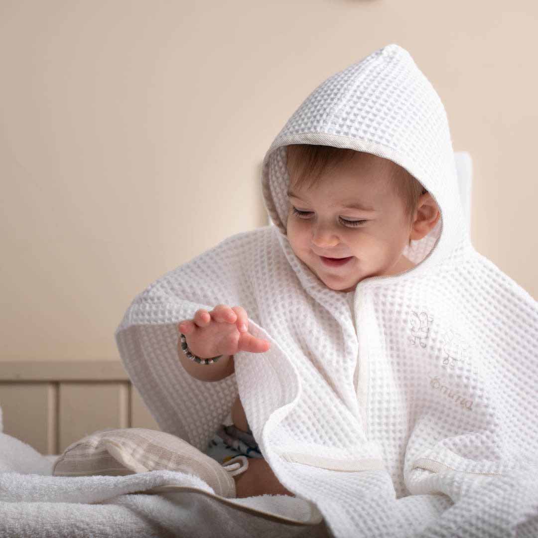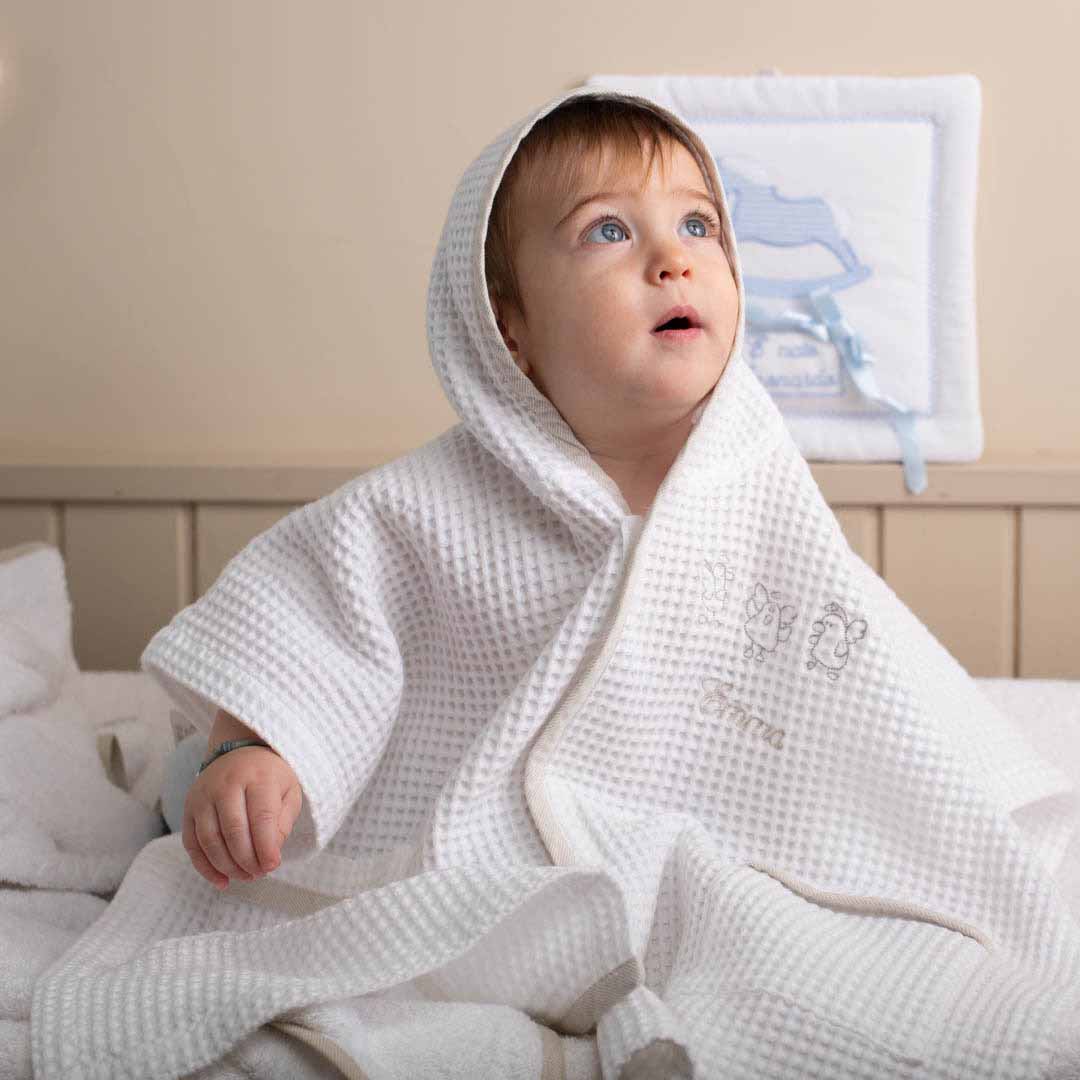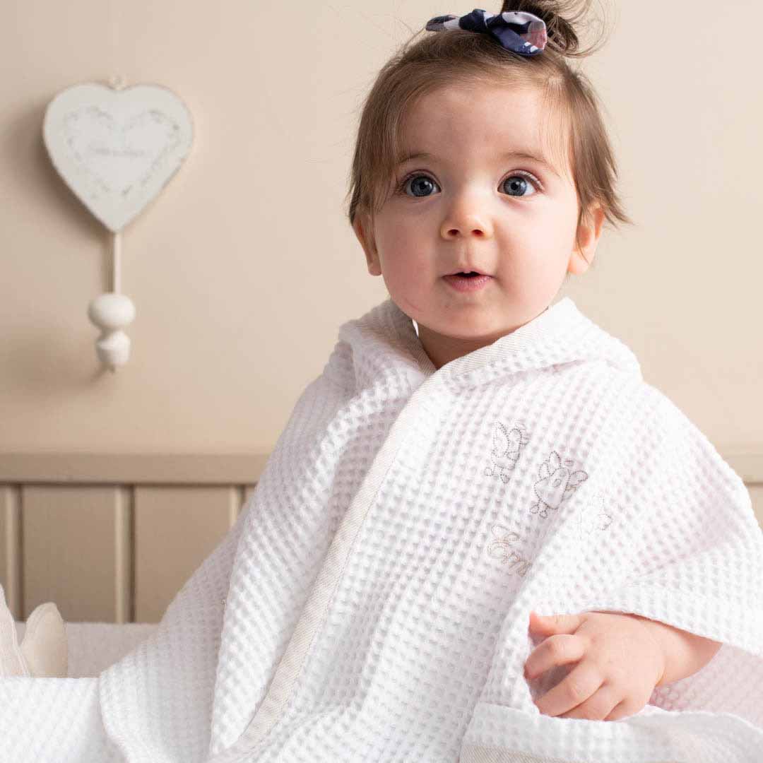 Adatto a bambini da 6 a 24 mesi circa. Accappatoio senza maniche, con cappuccio e taschine. Si apre completamente sul centro davanti. Chiusura con velcro.In morbida spugna bianca – 100% cotone. Molto soffice ed assorbente, si lava in lavatrice fino a 40°.