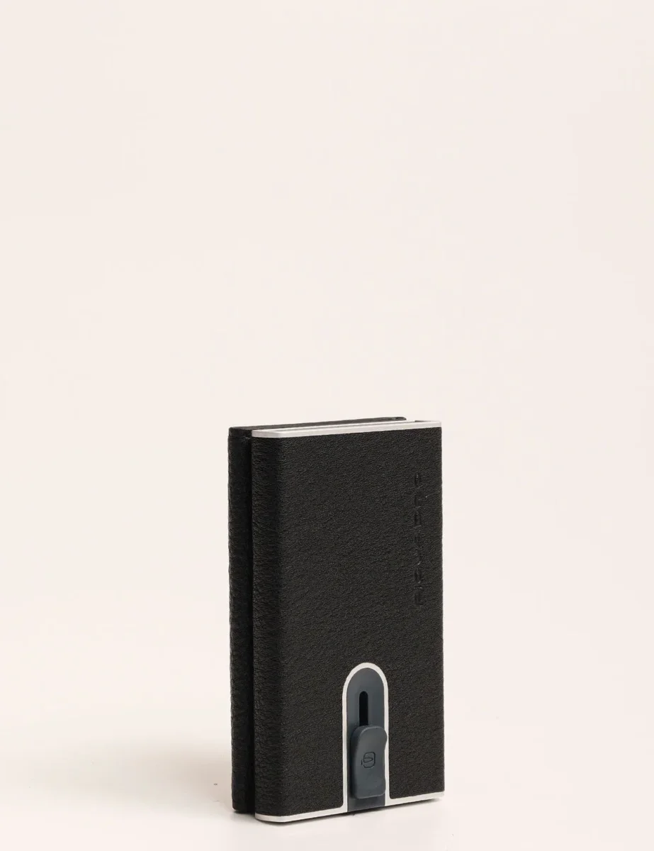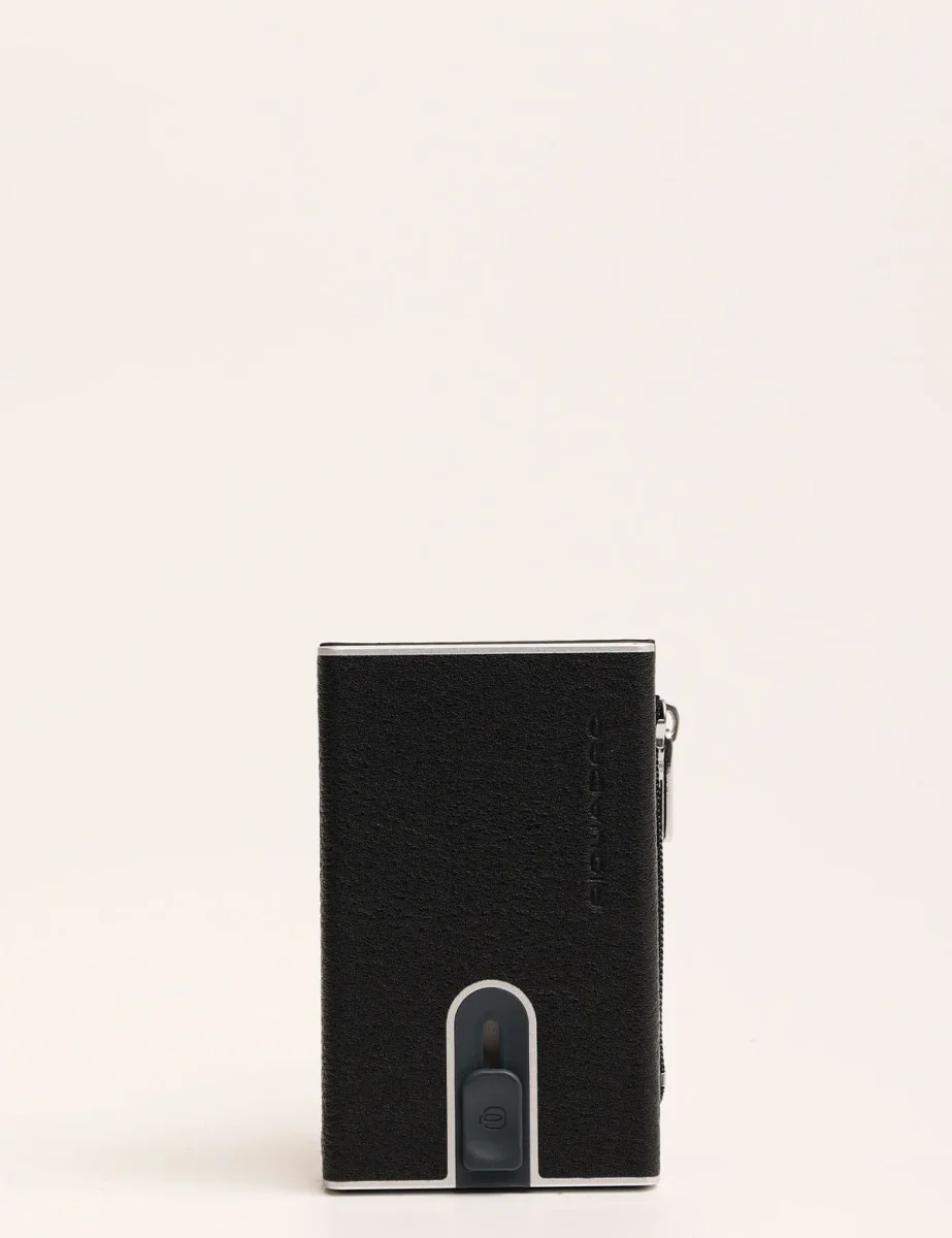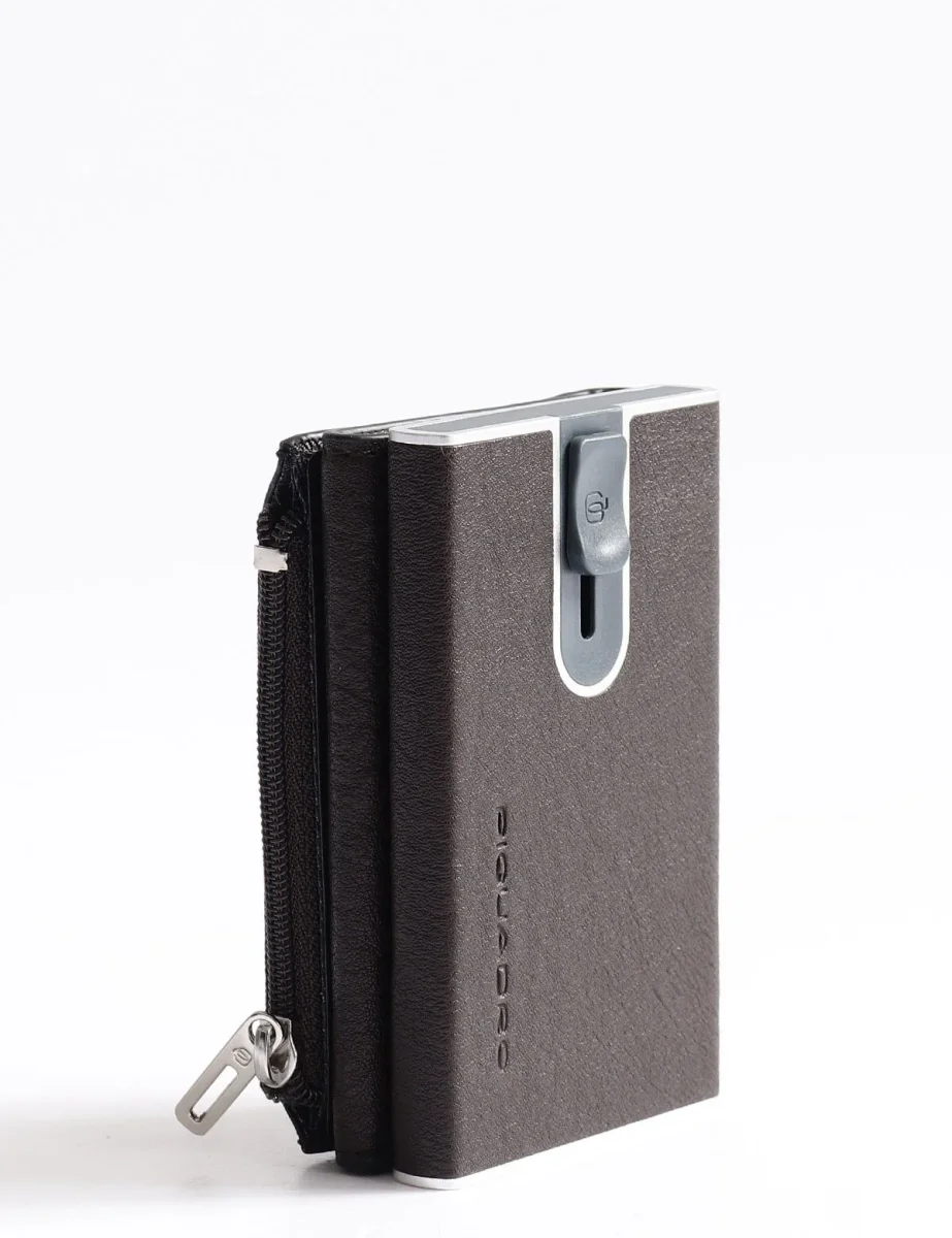 Portafoglio Piquadro modello compact wallet con sistema scorrevole per carte di credito, tasca posteriore con zip e scomparto porta banconote