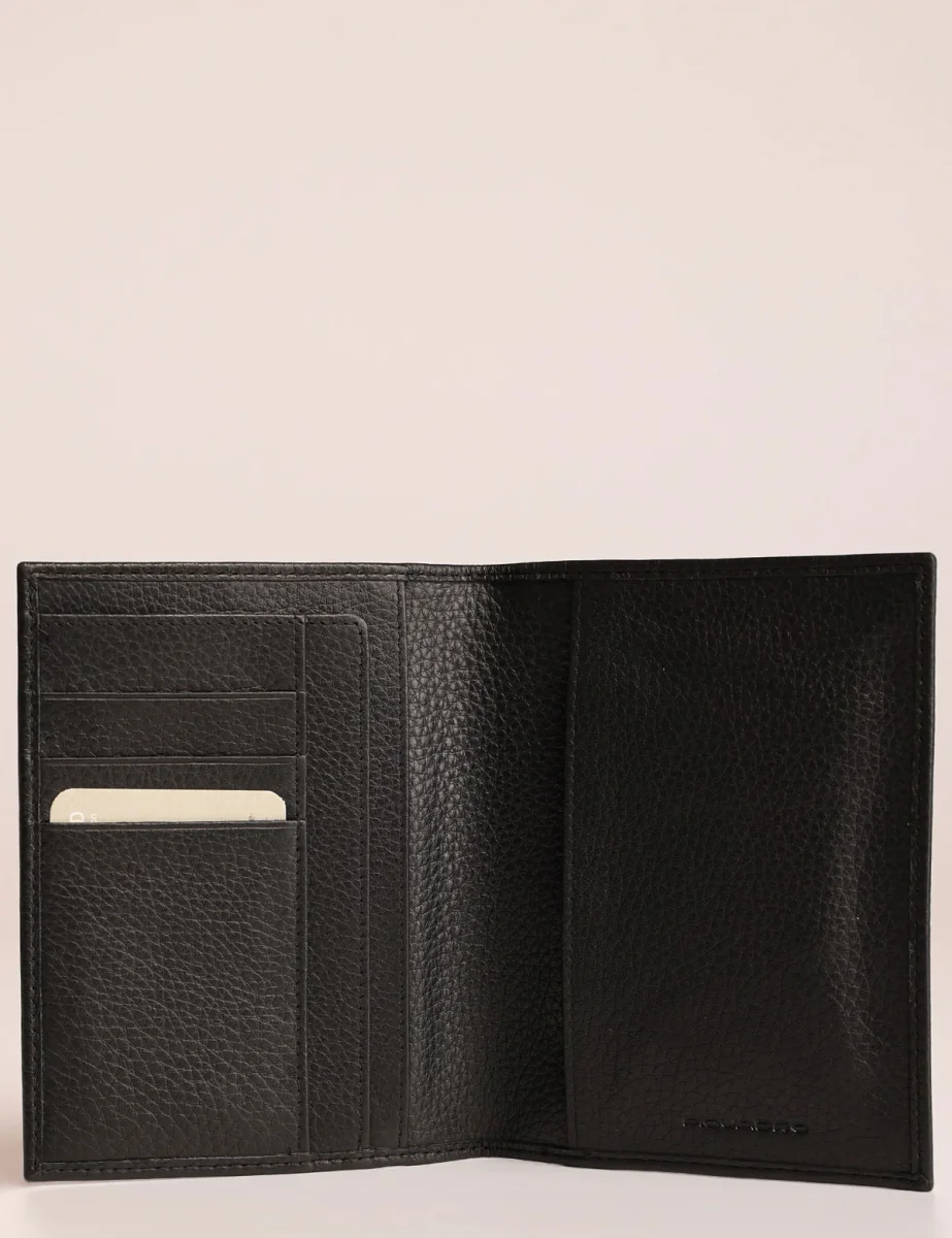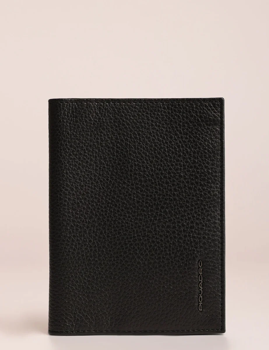 Porta documenti Piquadro con la misura per passaporto, modello con apertura verticale, realizzato in pelle