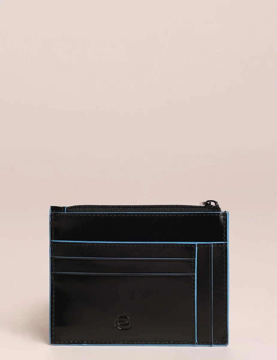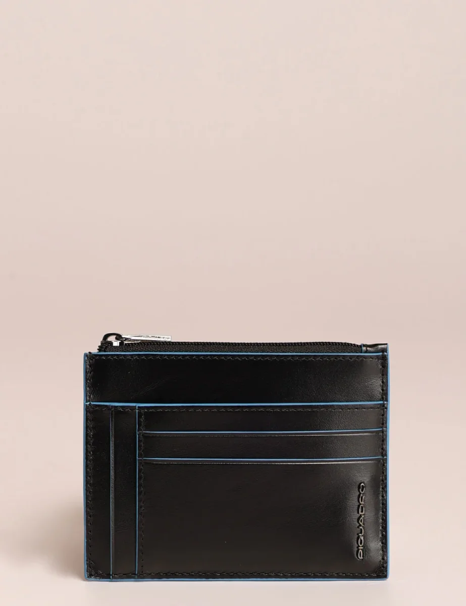 Bustina Piquadro in pelle, modello porta carte sottile con chiusura zip e slot da entrambi i lati.