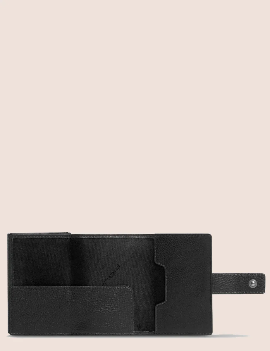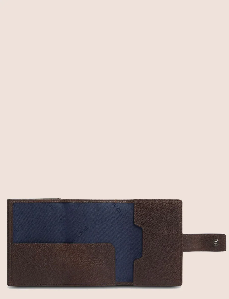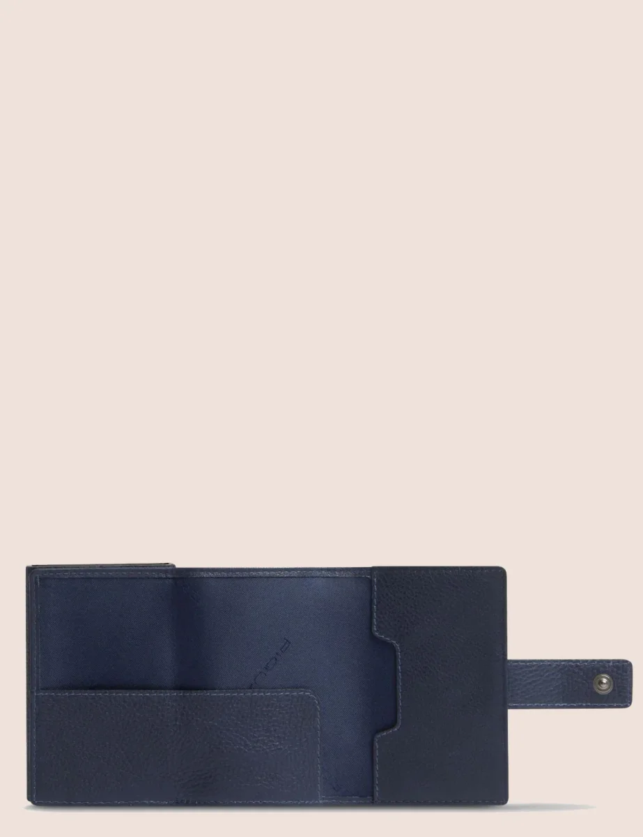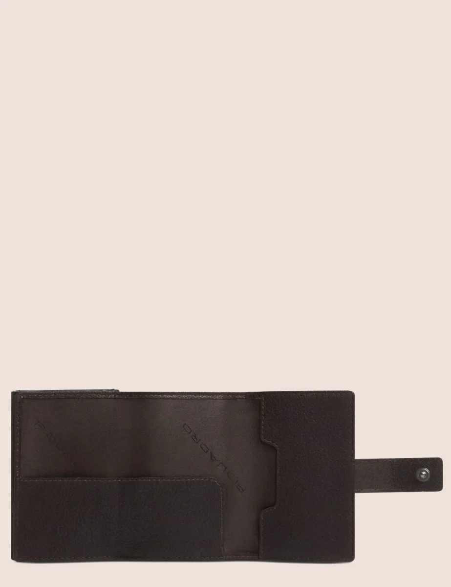 Portafoglio Piquadro con guscio rigido porta carte e scomparto porta documenti a piรน ante. Modello in pelle e tessuto