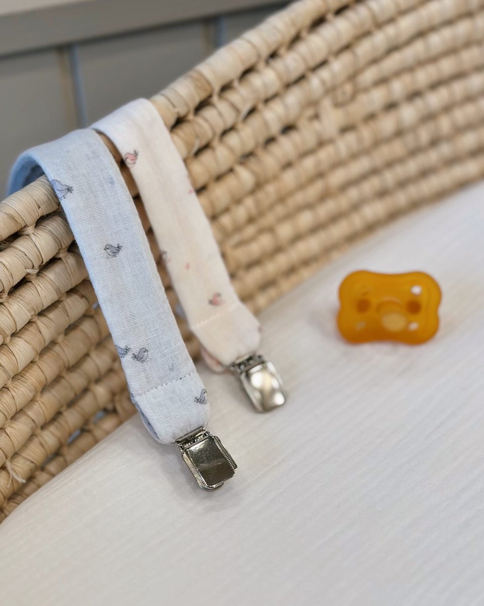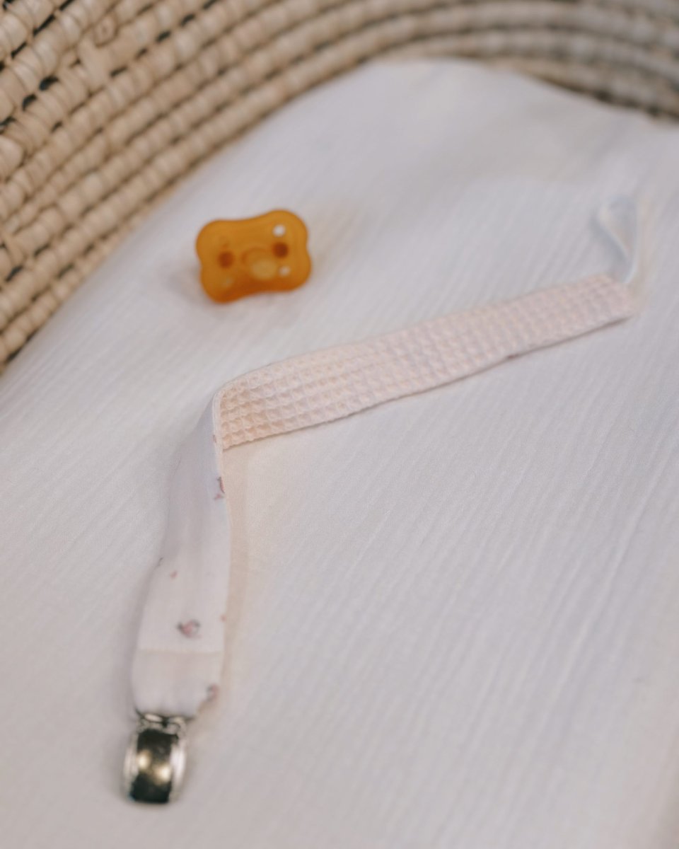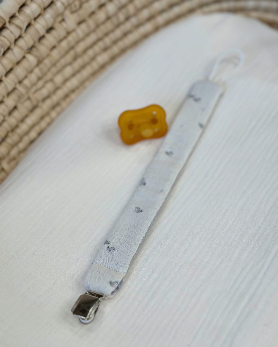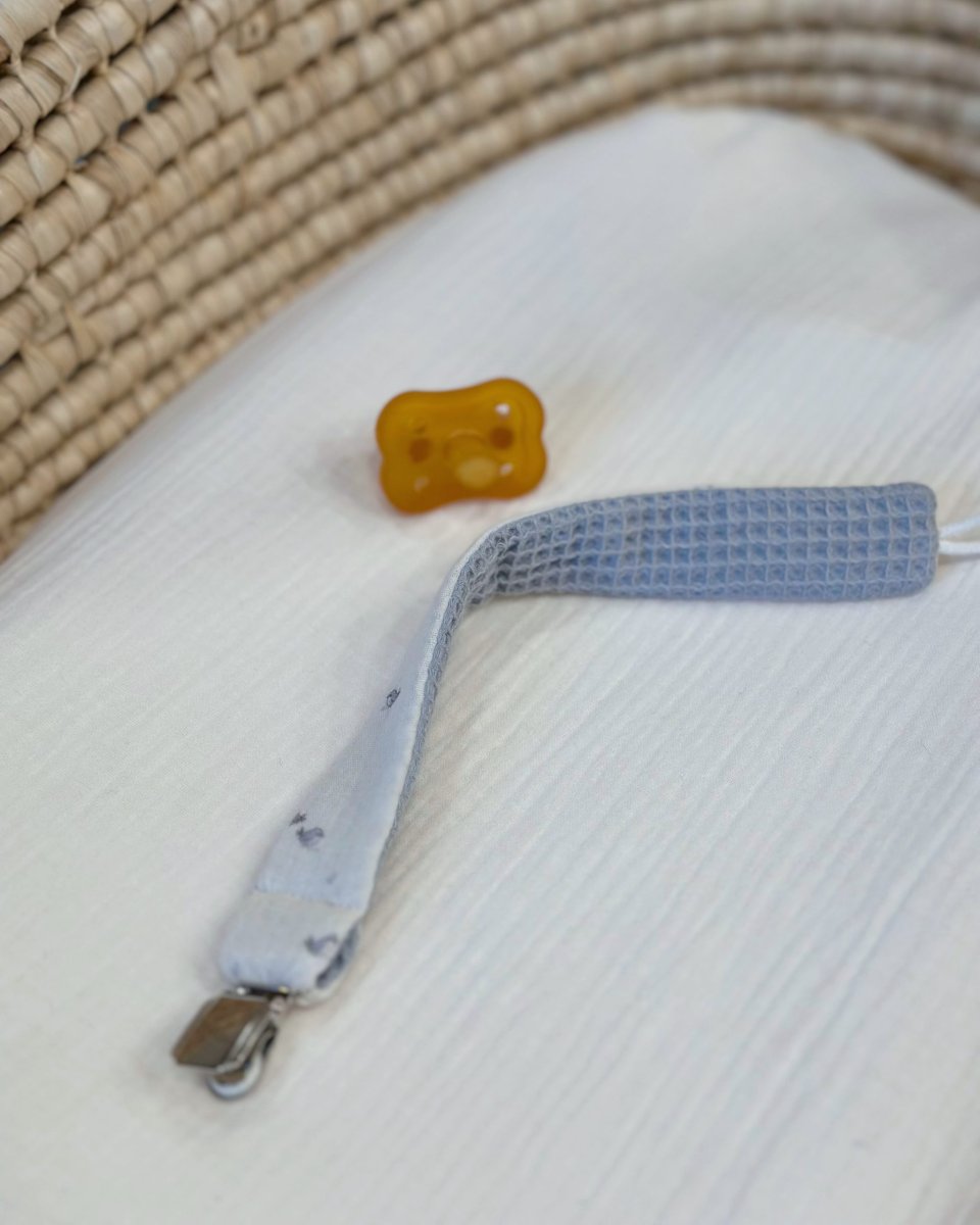Portaciuccio in mussola di cotone e nido d’ape, personalizzabile con il nome per non perderlo mai. Idea regalo sempre apprezzata, simpatica e utile.