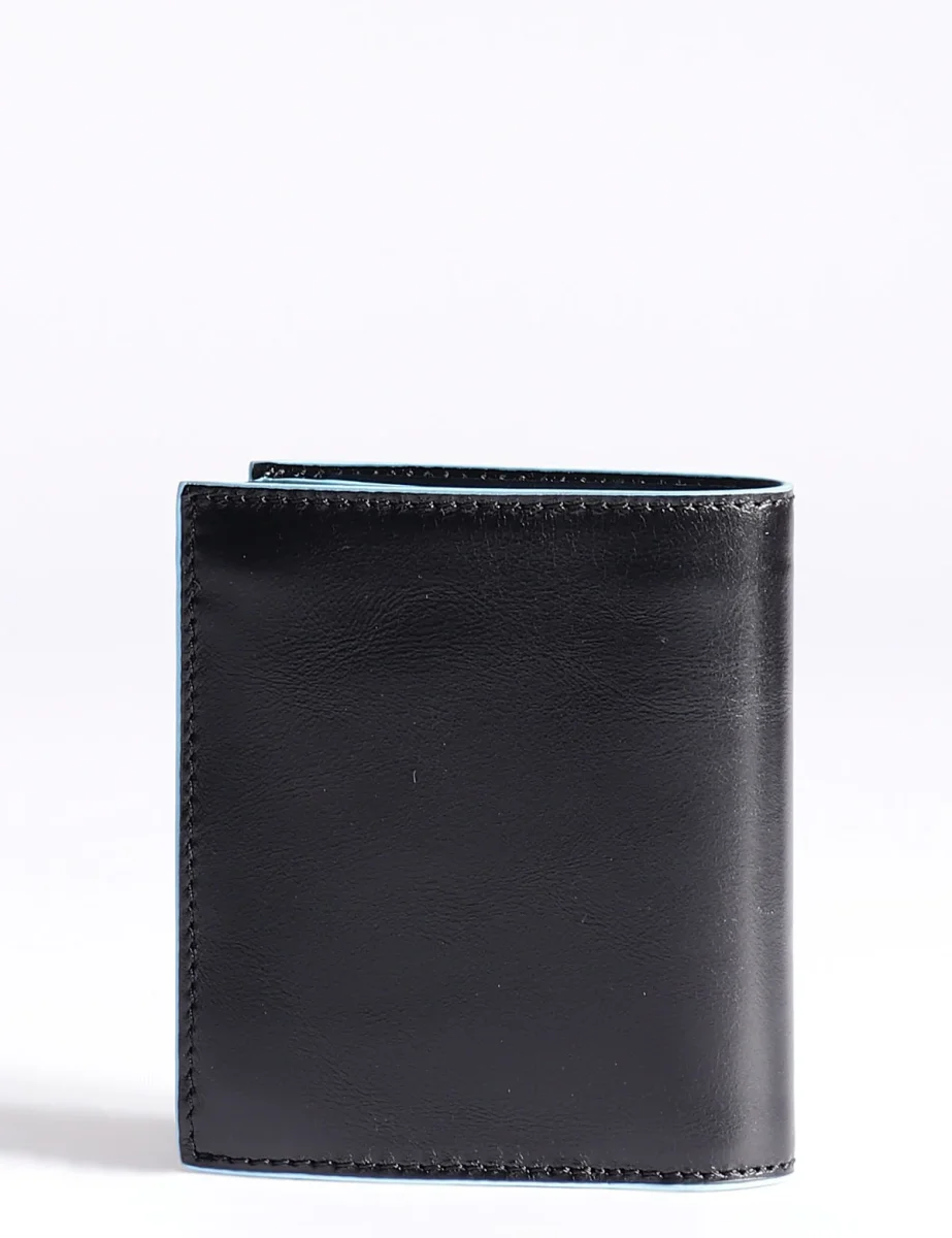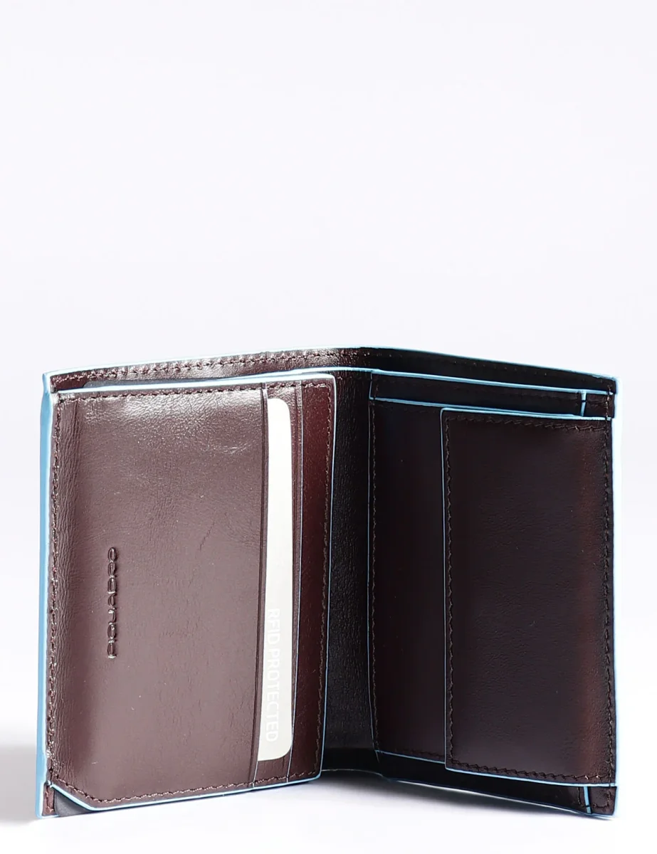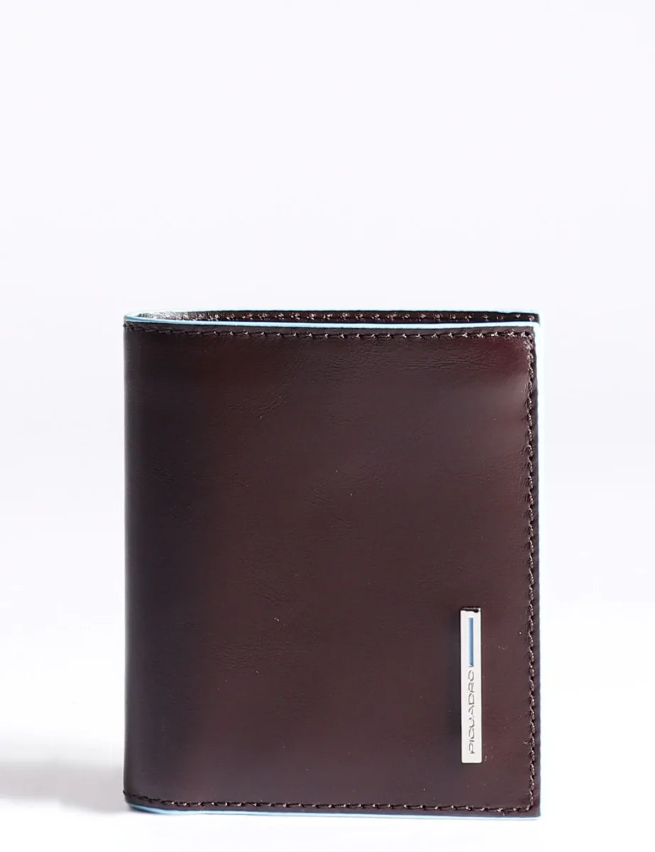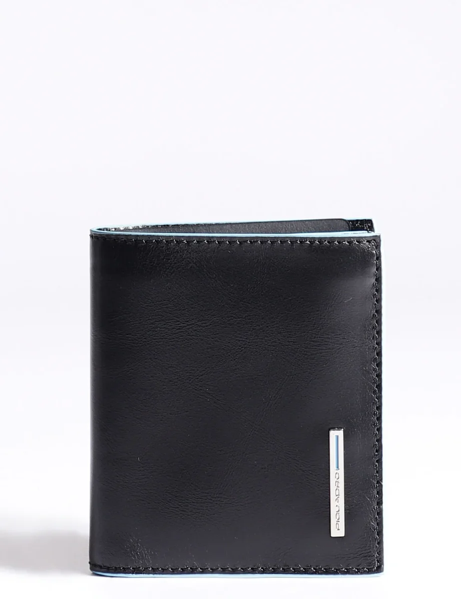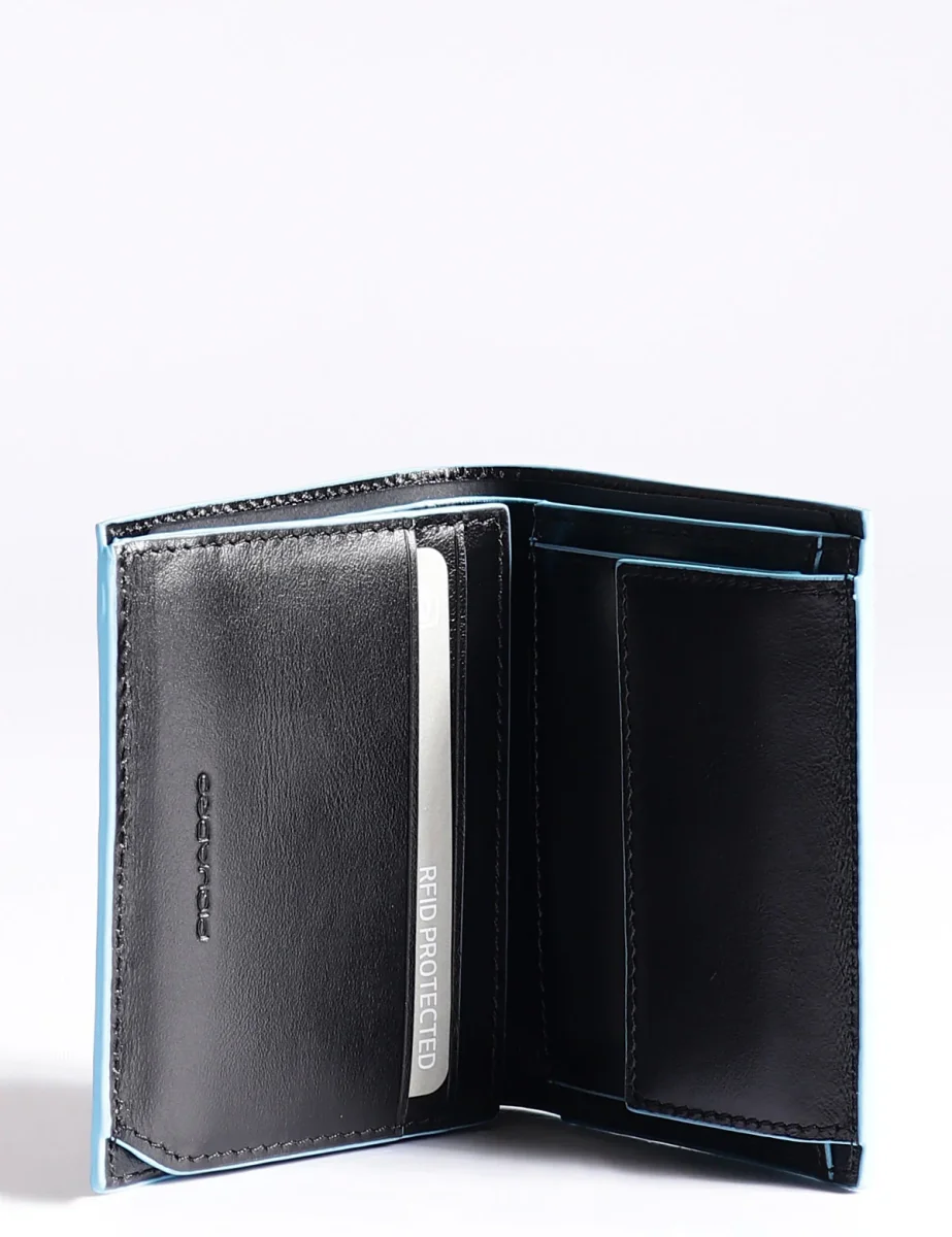 Portafogli da uomo Piquadro realizzato in pelle, modello con apertura verticale, portamonete interne e volantino porta documenti. Sistema di protezione antifrode RFID