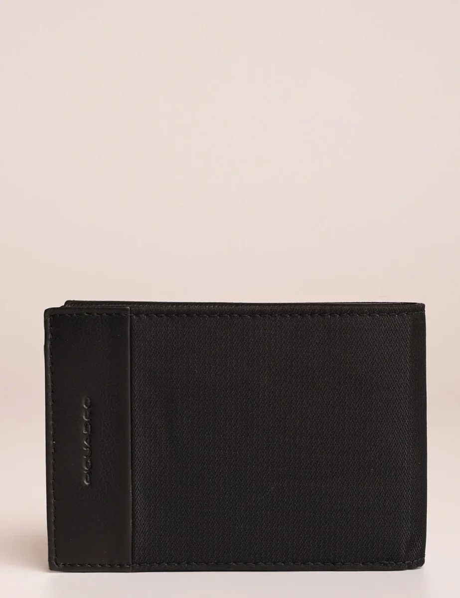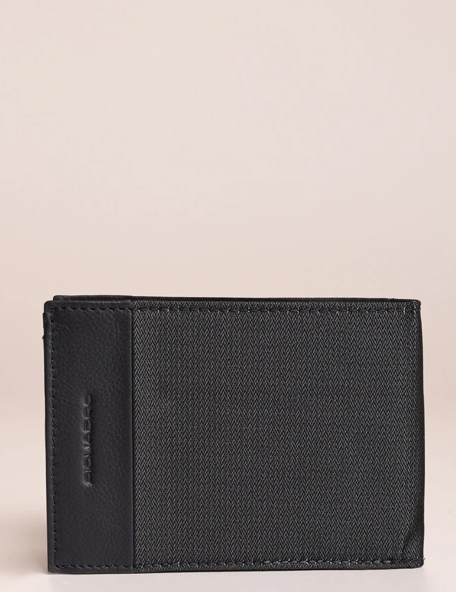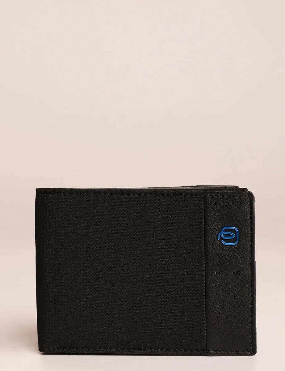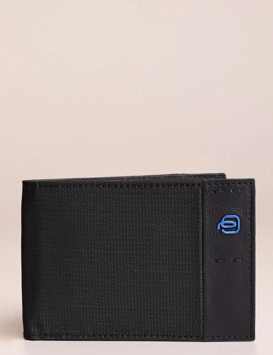 Portafogli da uomo Piquadro realizzato in tessuto e pelle e dotato di scomparti per documenti, carte e monete. Modello con sistema di protezione antifrode RFID