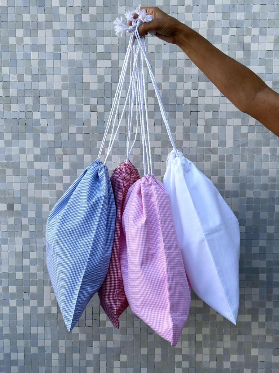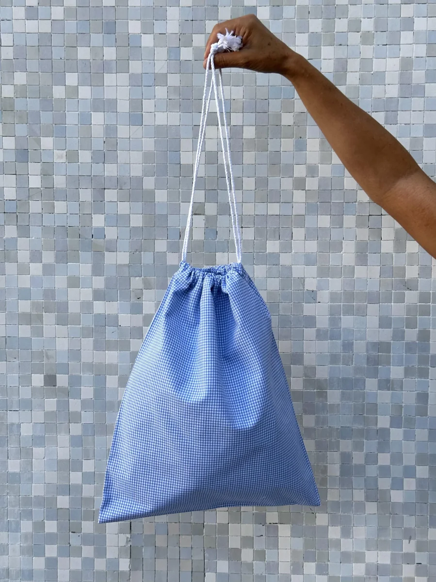 Sacchetto asilo a quadretti, 100% cotone. Cordini in cotone per regolare la chiusura.