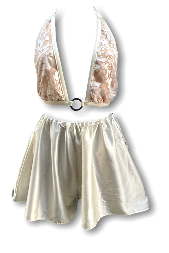 Uno shorts veloce e comodo da indossare, della linea Sposa. Adatto a tutte le tipologie di donne grazie al laccio in vita che permette una vestibilitร dalla 38 alla 48. Sfizioso come una gonnellina, renderร il tuo look glamour anche indossato di sera, รจ arricchito dal disegno esclusivo, firmato Ludovica L’Amante. Lasciati trasportare dalla tendenza dell’estate: un capo che i seguirร per tutta la giornata!