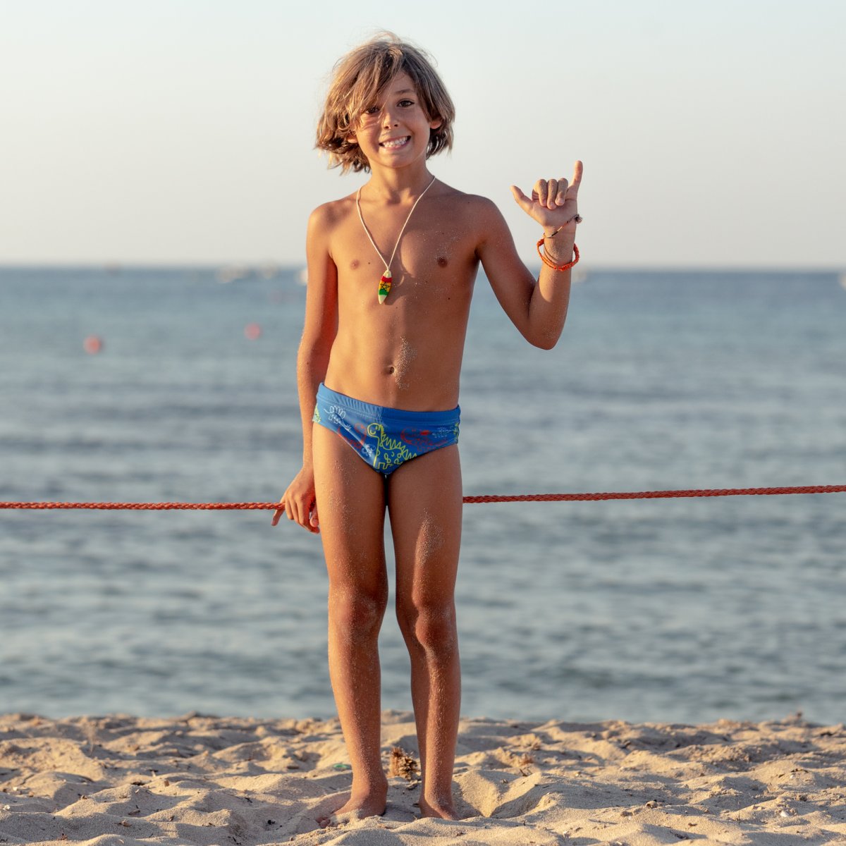 Slip nuoto bimbo comodo ed elastico, Tessuto anti-cloro. Il costume รฉ progettato per resistere all’uso giornaliero, anche in presenza di elevate quantitรก di cloro. Completamente foderato al suo interno per evitare trasparenze, e cuciture rinforzate per una maggiore durabilitรก.