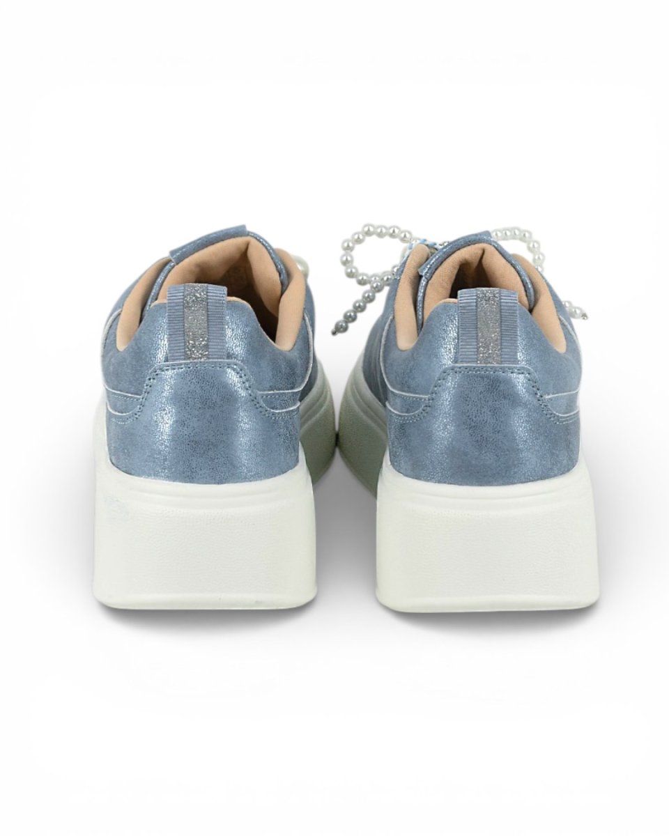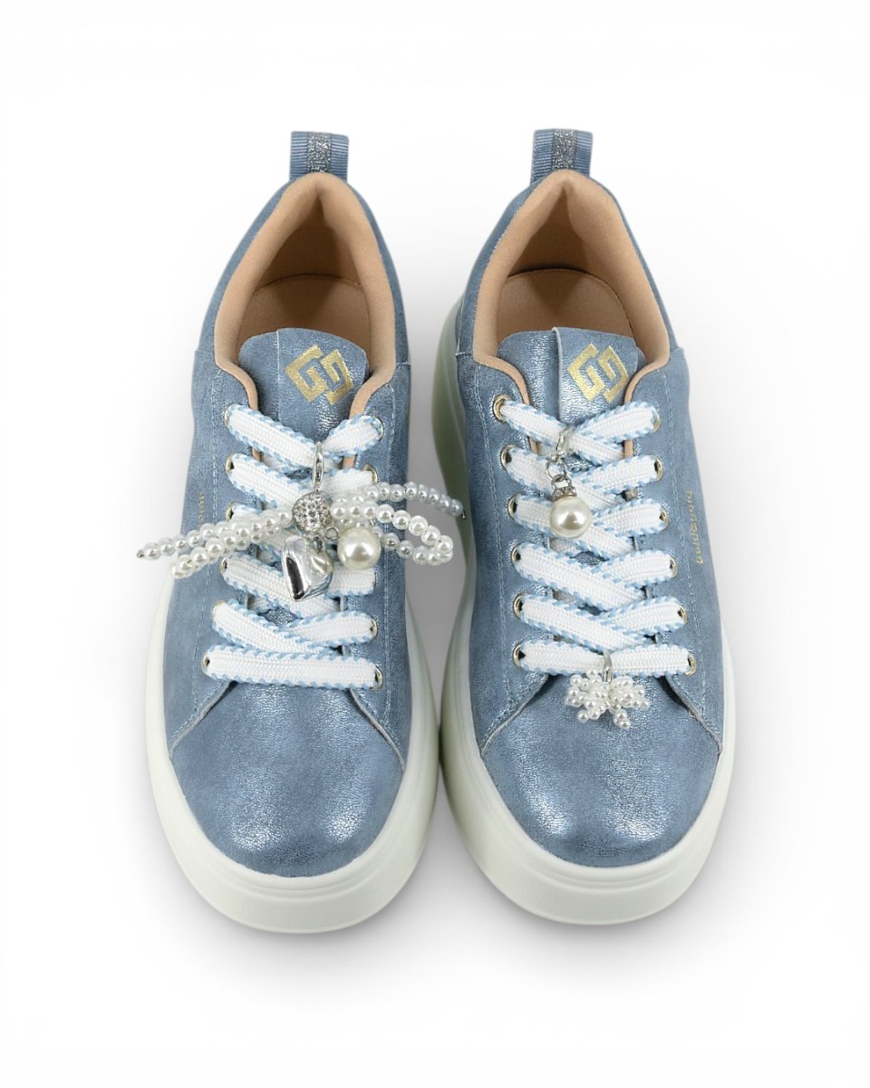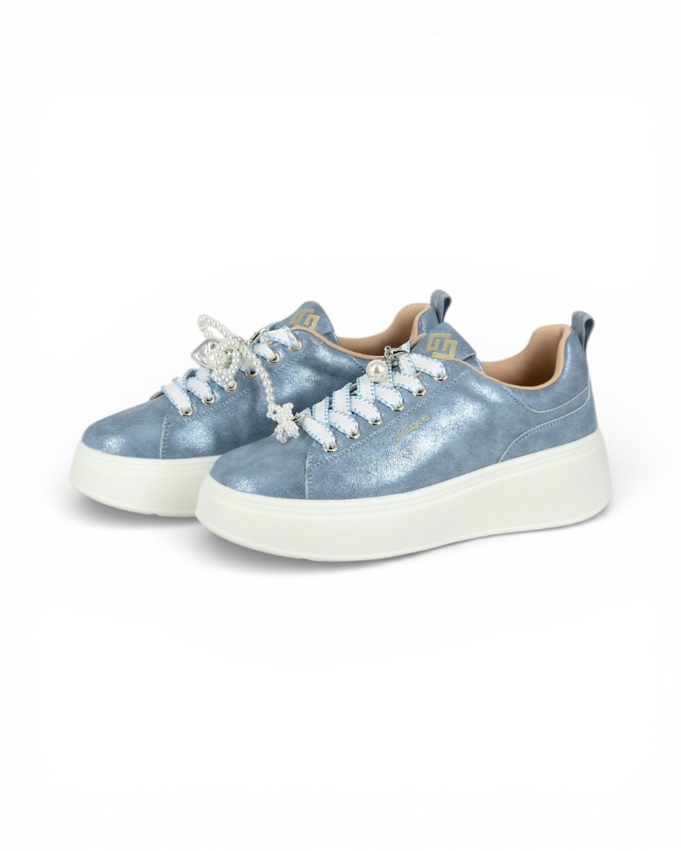 Sneaker Gold&Gold con platform e dettagli gioiello, perfette per chi ama unire comfort e stile. Tomaia in materiale sintetico effetto pelle, chiusura con lacci e charm decorativi con perle e strass (removibili), linguetta posteriore con strass. Suola platform leggera e confortevole, alta 4 cm . Calzata comoda. Stile casualโfashion, ideale per ogni giorno.