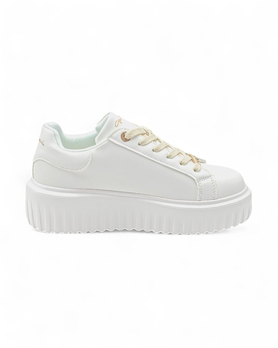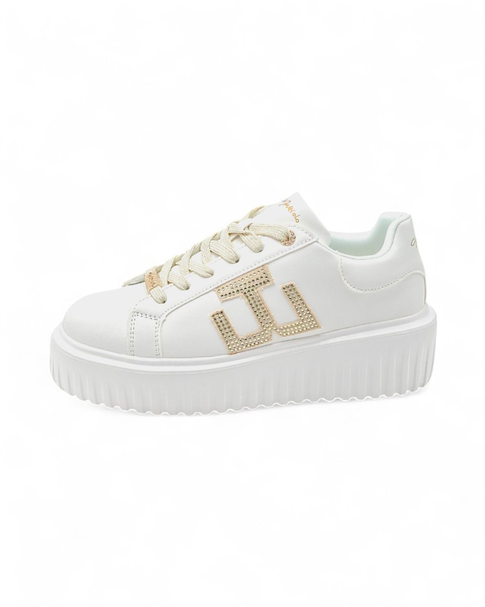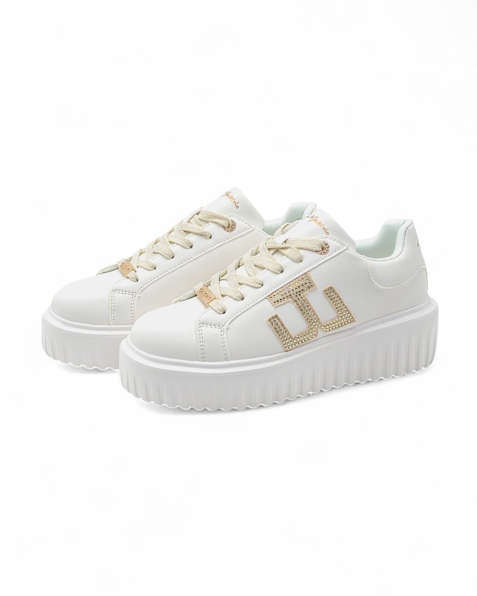 Sneakers dallo stile raffinato adattabili a qualunque outfit, da quello sportivo a quello piรน elegante. Realizzate in similpelle bianca con logo in strass dorato laterale, scritta logo dorata su linguetta e tallone, placchetta logata sui lacci. Calzata facile e confortevole. Interno foderato e imbottito. Suola in gomma platform antiscivolo. Altezza suola: 5 cm