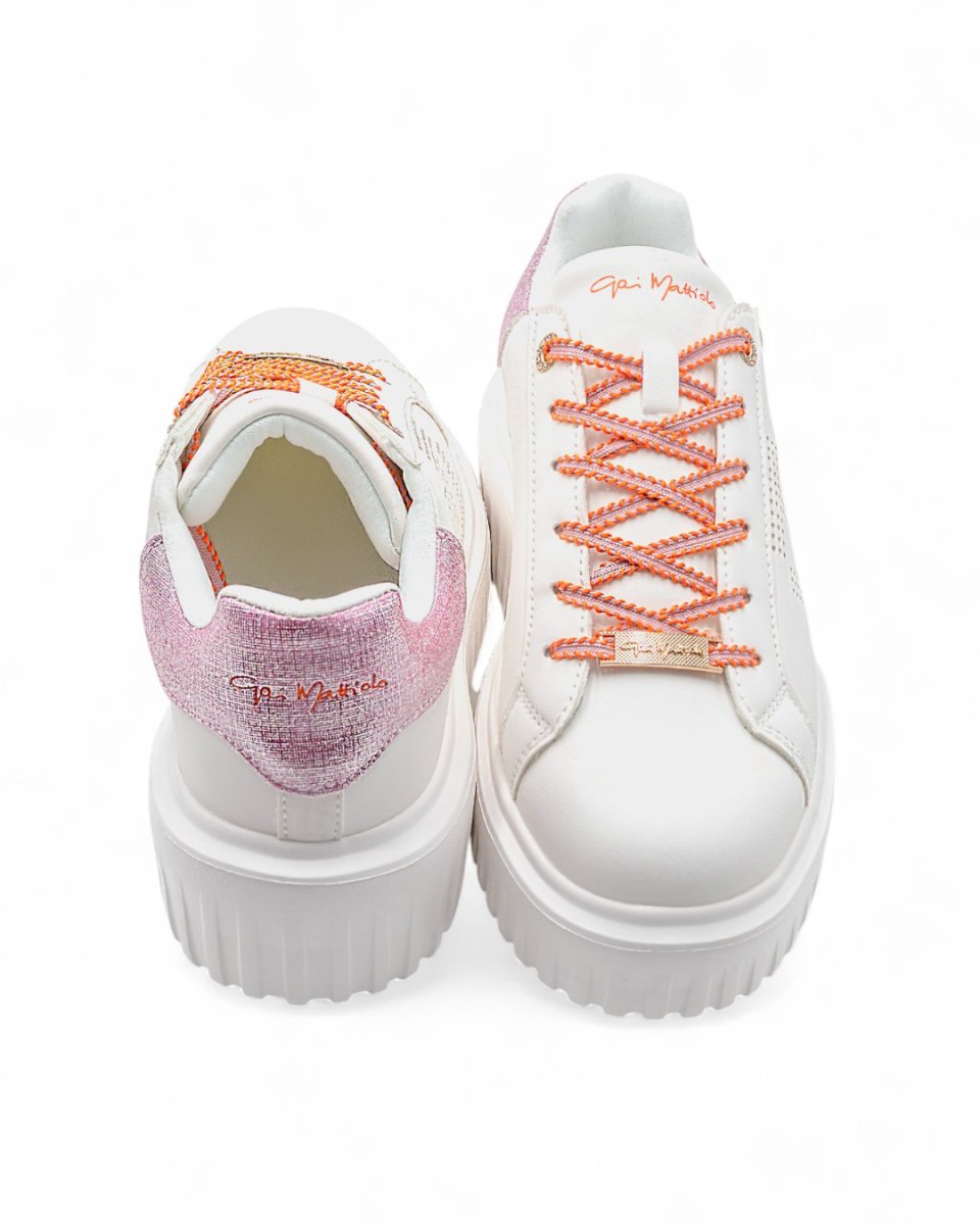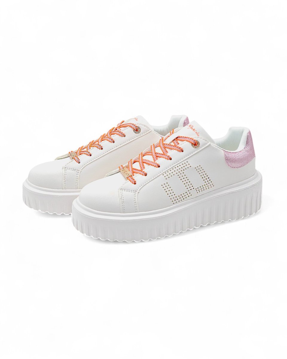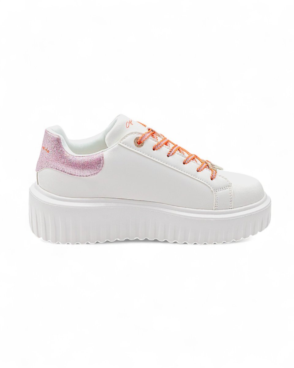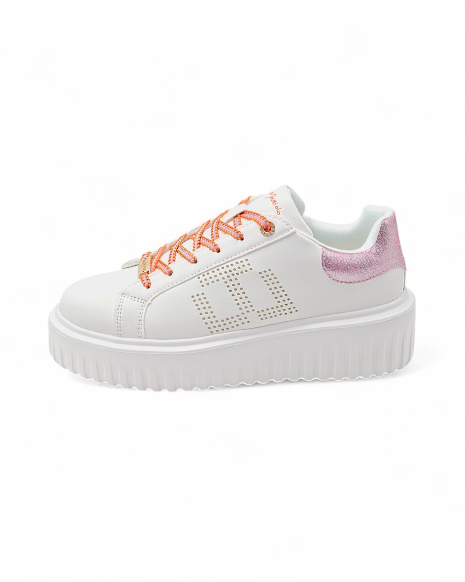 Sneakers dallo stile raffinato adattabili a qualunque outfit, da quello sportivo a quello piรน elegante. Realizzate in similpelle bianca con logo traforato laterale, inserto in similpelle rosa glitter su tallone, scritta logo su linguetta e tallone, placchetta logata sui lacci in tessuto bicolor. Calzata facile e confortevole. Interno foderato e imbottito. Suola in gomma platform antiscivolo. Altezza suola: 5 cm