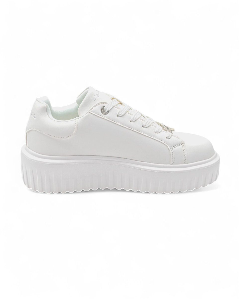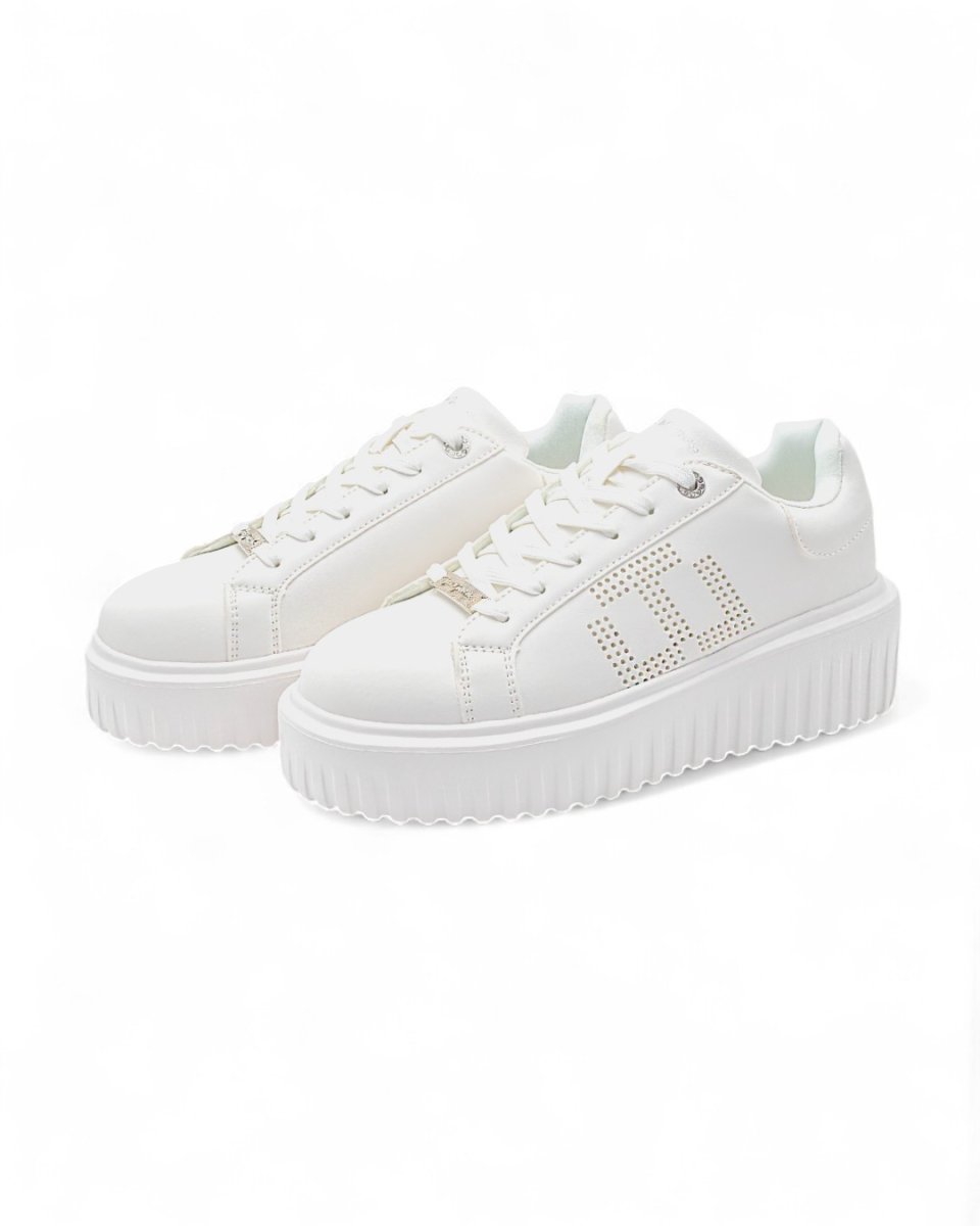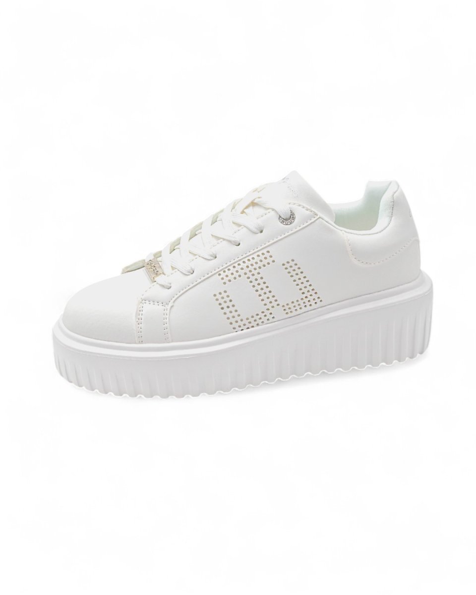 Sneakers dallo stile raffinato adattabili a qualunque outfit, da quello sportivo a quello piรน elegante. Realizzate in similpelle bianca con logo traforato laterale, scritta logo su linguetta e tallone, placchetta logata sui lacci. Calzata facile e confortevole. Interno foderato e imbottito. Suola in gomma platform antiscivolo. Altezza suola: 5 cm