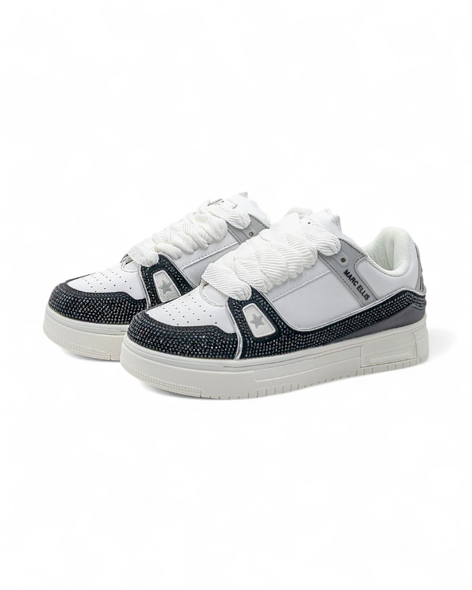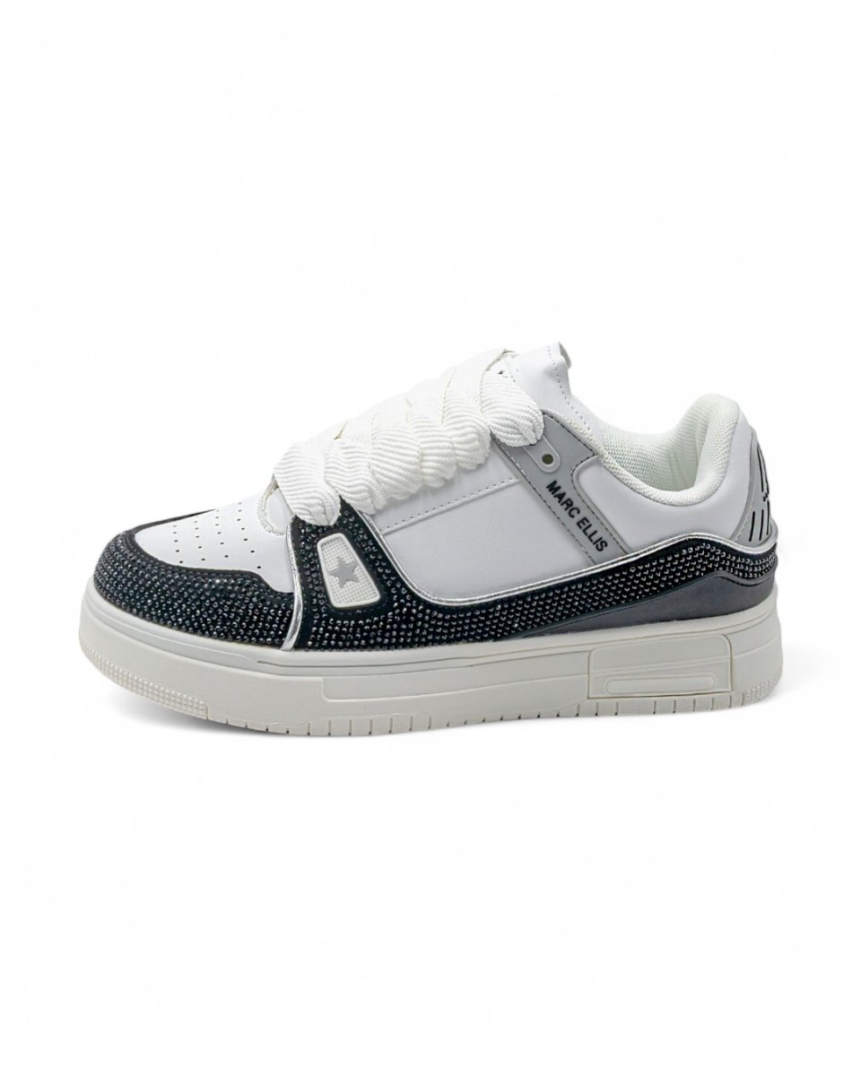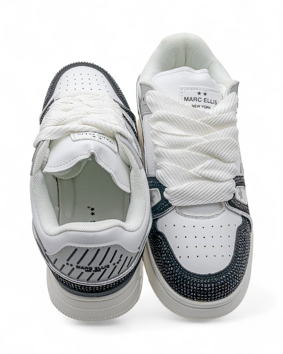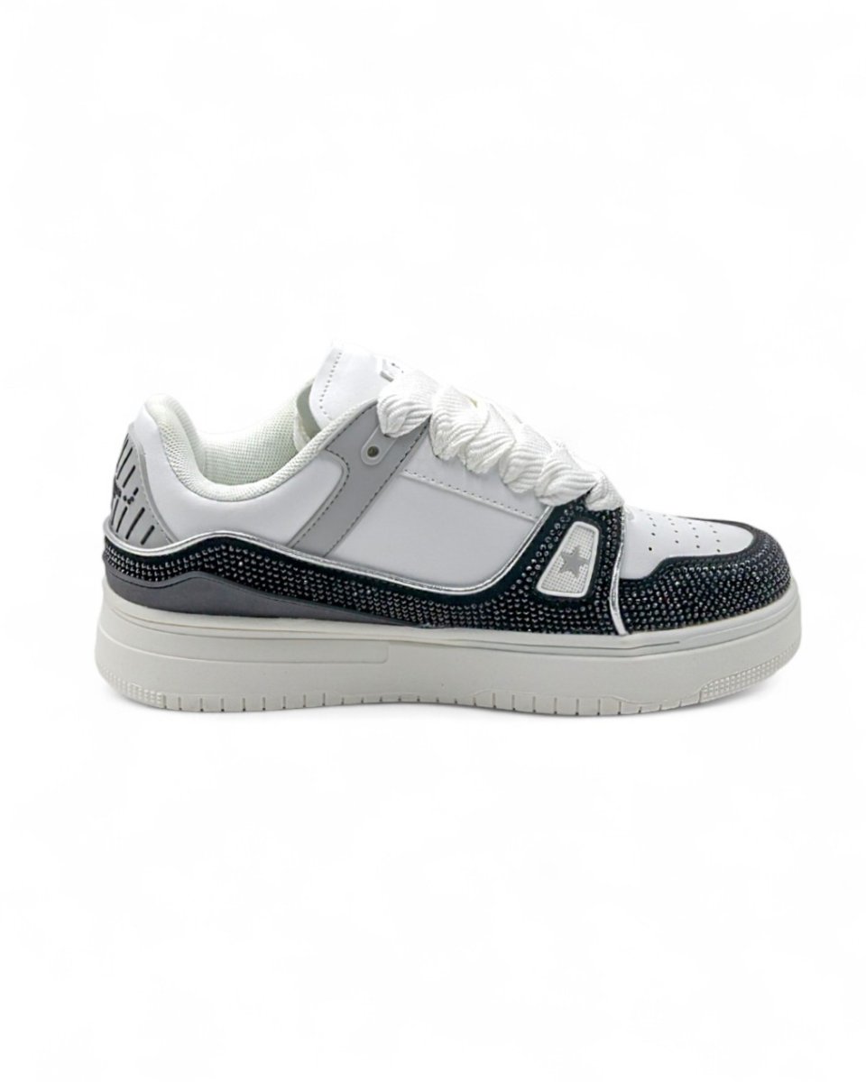 Sneakers platform donna bianche in ecopelle, con inserti strass a contrasto colore, logo laterale, su linguetta e su retro. Soletta in memory foam. Lacci intercambiali con il nero/marrone. Suola: 3,5 cm