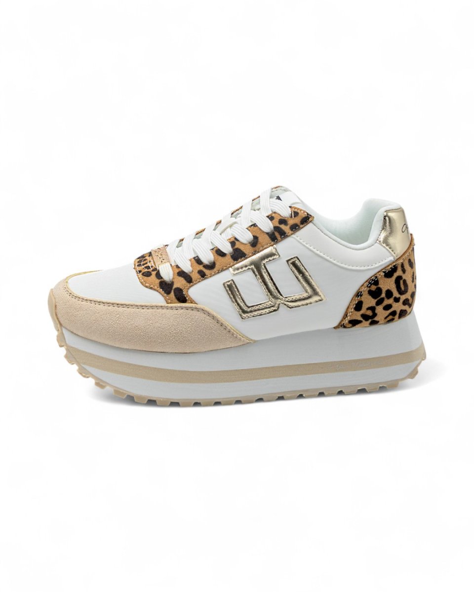 Sneakers runner dallo stile raffinato adattabili a qualunque outfit, da quello sportivo a quello piรน elegante. Realizzate in tessuto impermeabile bianco con inserti in tessuto scamosciato beige e leopardati, logo laterale e inserto su tallone laminato oro, logo nero su linguetta, scritta logo nera su tallone, placchetta logata sui lacci. Calzata facile e confortevole. Interno foderato e imbottito. Plantare estraibile in tessuto. Suola in gomma con intagli in rilevo. Altezza suola: 4 cm