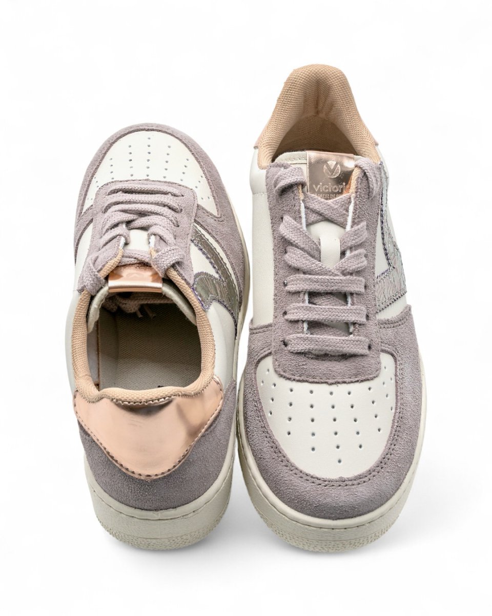 Sneakers da donna bianche realizzate in Spagna in materiale effetto pelle e inserti in crosta di pelle color lilla. V craquelรฉ argento sul lato e dettagli metalizzati oro rosa sulla parte posteriore e sull’etichetta della linguetta. Chiusura con lacci tono su tono. Leggere, comode e traspiranti.