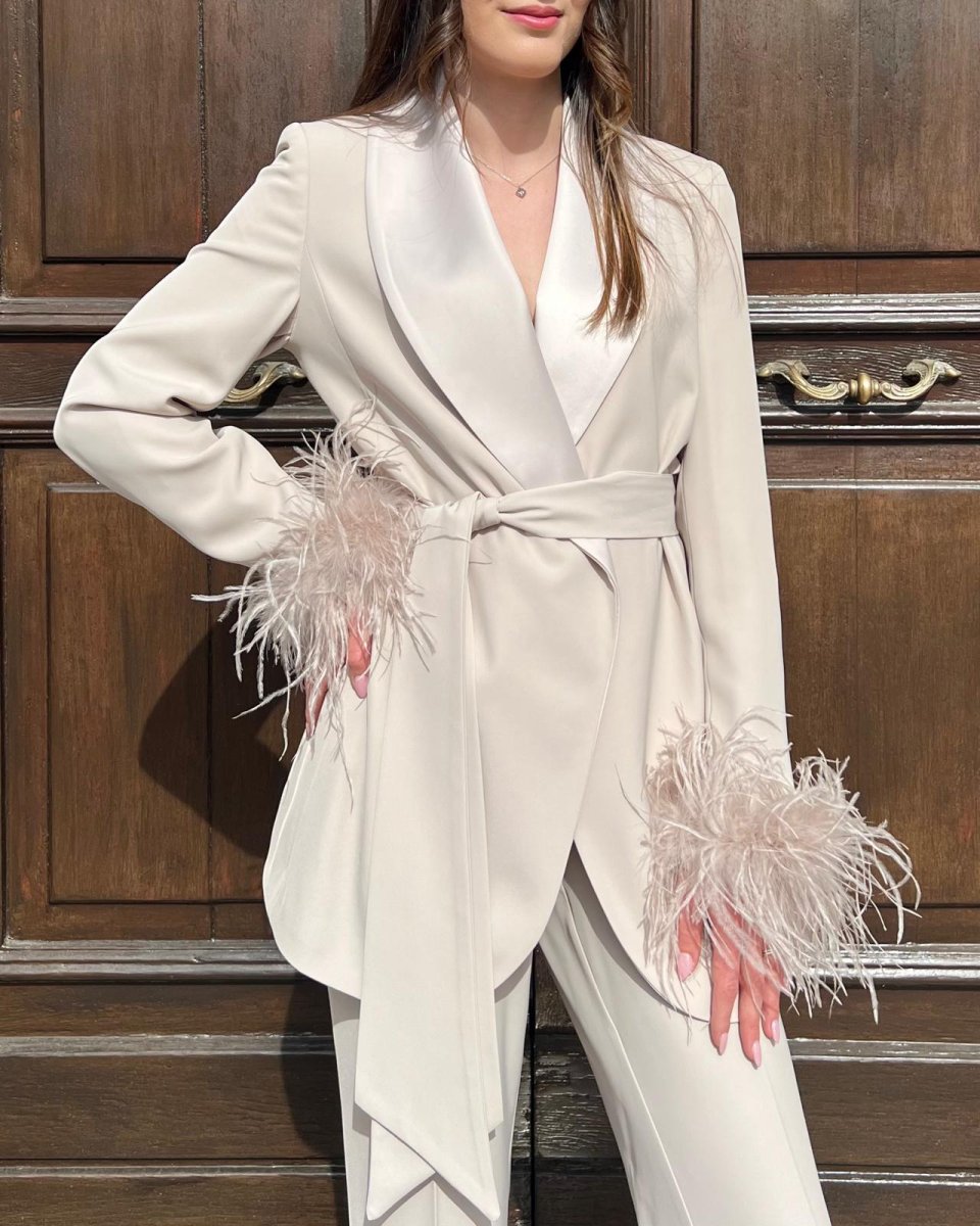 Giacca modello blazer con revers stondati con fila di piume in tinta sul lato destro. Chiusura con fusciacca lunga.