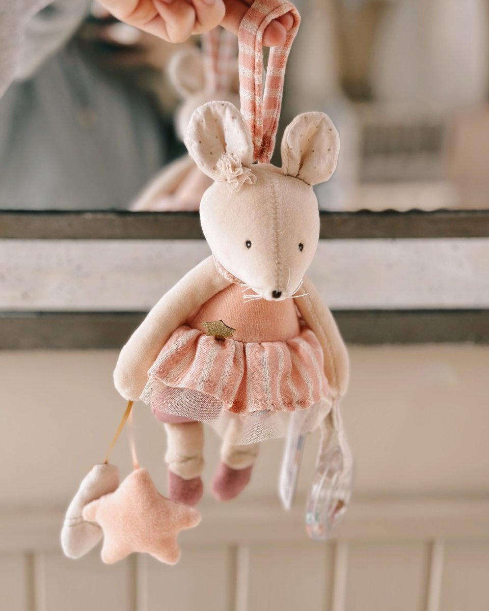 Topolino attività da appendere che porta con sé tante sorprese per emozionare il bambino! Tra le zampe tiene un anello a sfera, una stellina, una foglia che suona come carta stropicciata e nasconde uno specchio sotto il tutù…