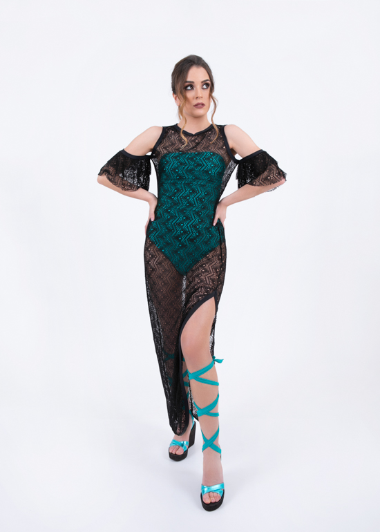 Vestito Dalila Twister : Abito lungo trasparente in pizzo con spacco laterale sinistro e maniche a balze. Non potrai farne a meno!