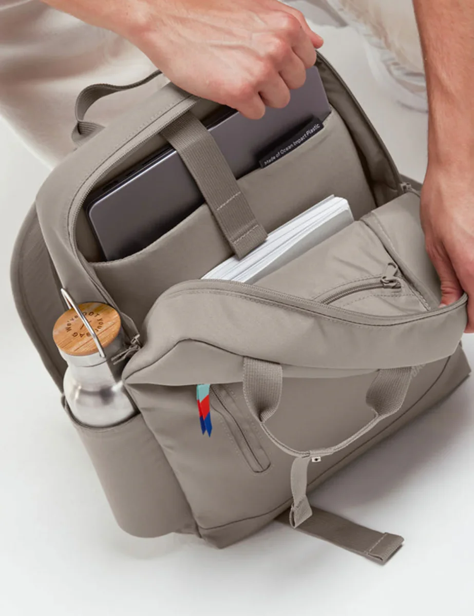 Zaino porta computer Got Bag con due manici superiori e taschina frontale verticale con zip. Modello realizzato con materiale riciclato proveniente dall’Oceano, impermeabile e privo di PVC e PFC