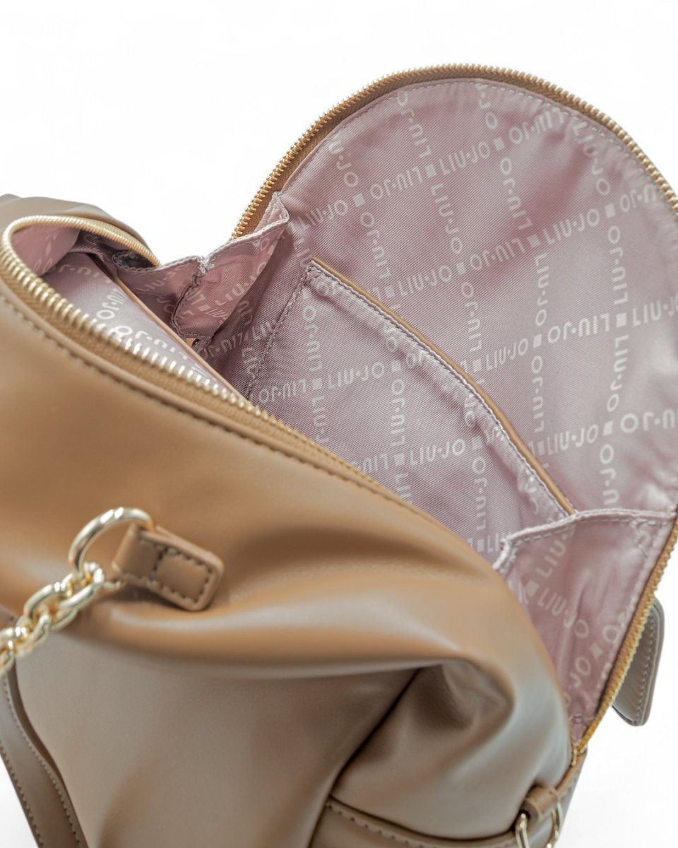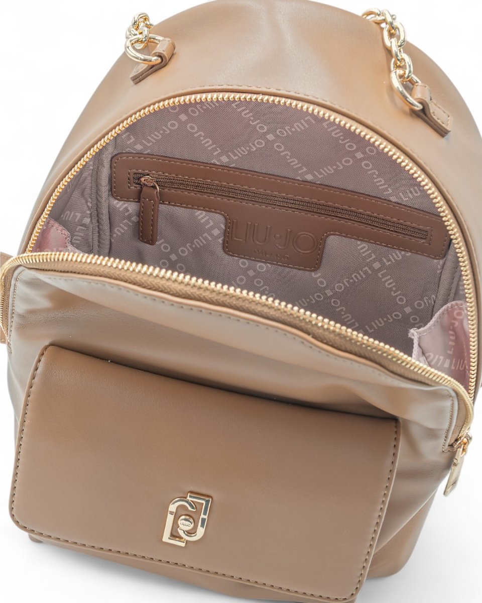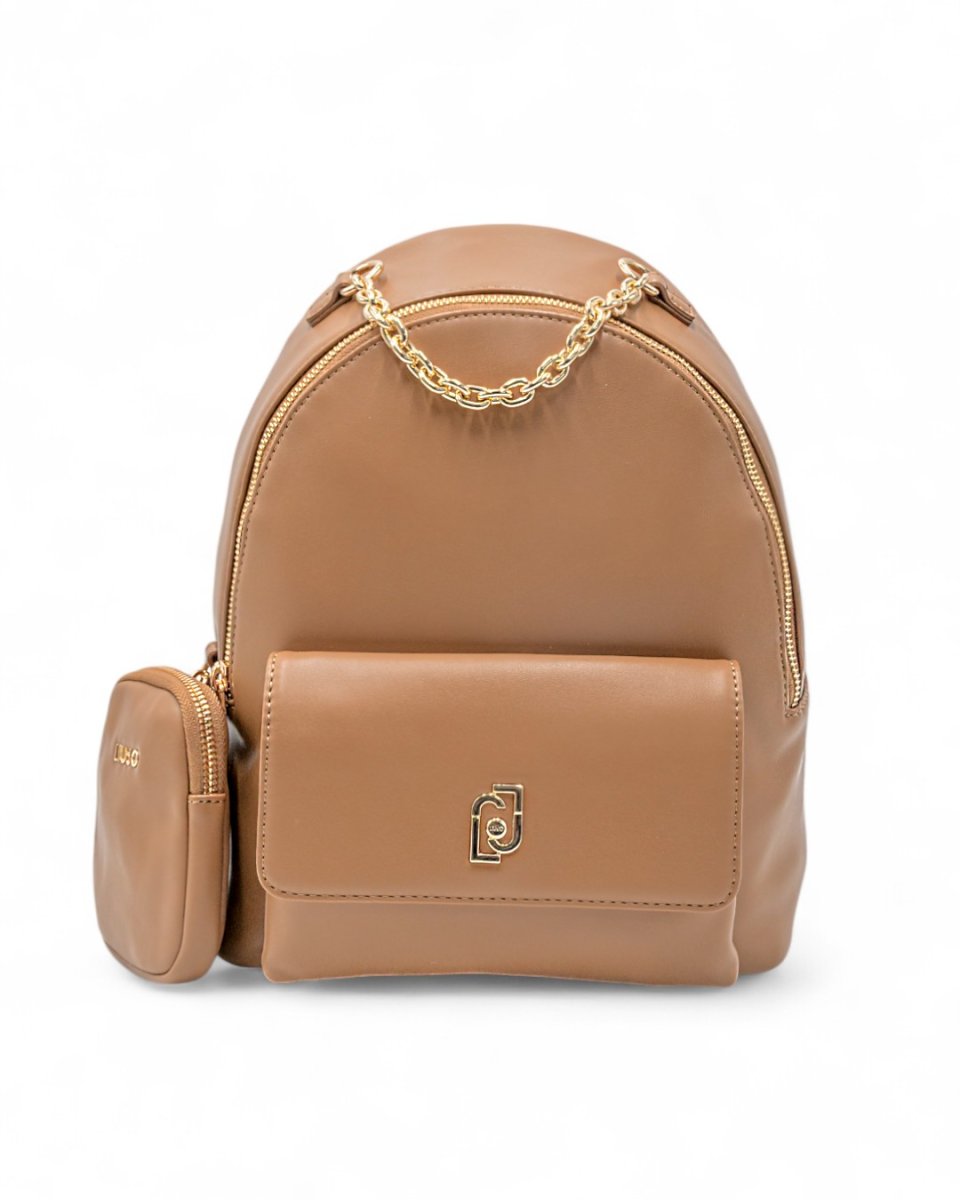 Zaino da donna Liu-Jo, realizzato interamente in poliuretano di alta qualitร , รจ un accessorio di stile che unisce eleganza e praticitร . Dotato di charm marsupio accessorio, chiusura con zip, tasca frontale con patta con logo metallico applicato, catena superiore, spallacci regolabili.