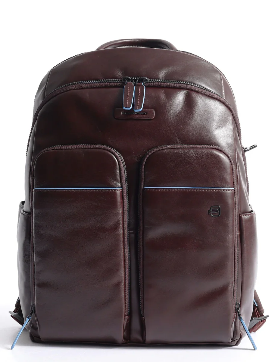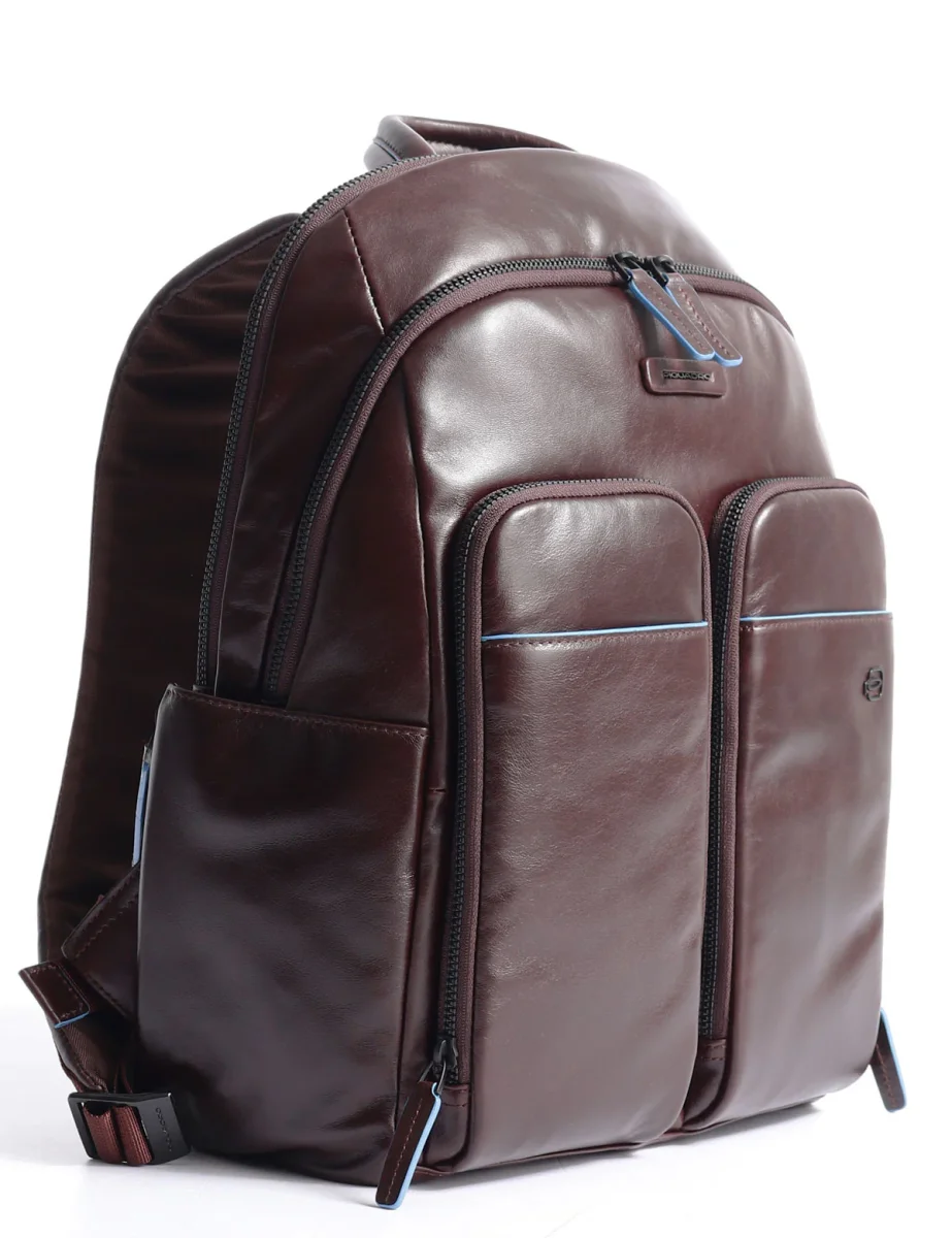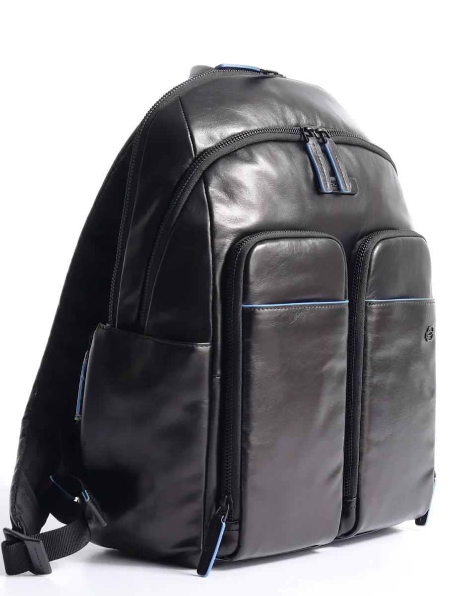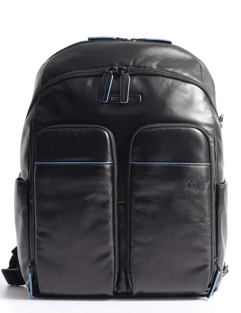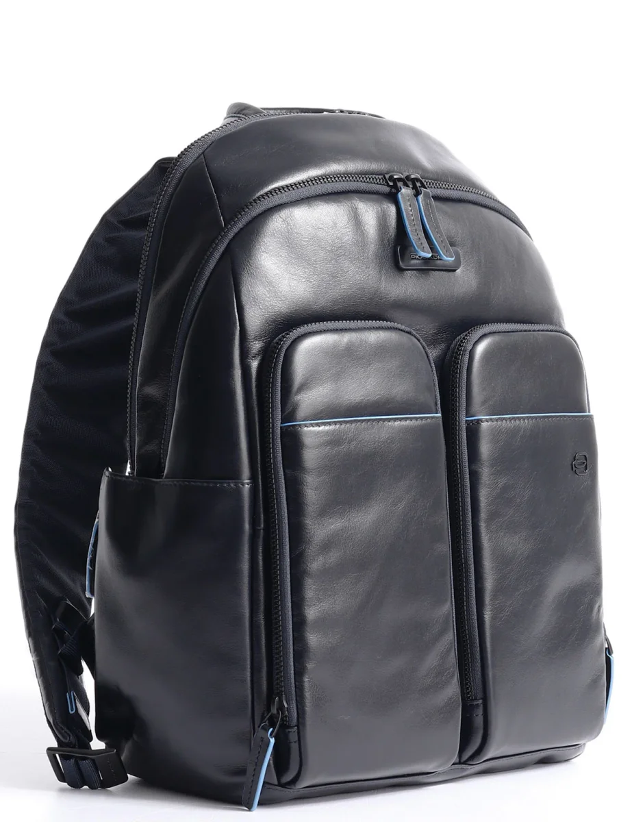 Zaino in pelle Piquadro dotato di tasche frontali, due ampi scomparti con zip, slot porta tablet fino a 11 pollici e tasca porta computer fino a 14 pollici