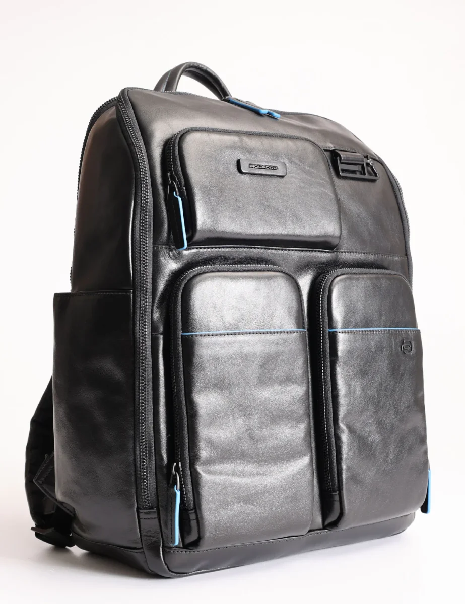 Zaino in pelle Piquadro con ampie tasche frontali e una laterale porta bottiglia/ombrello, modello dotato di scomparto porta computer fino a 15.6”