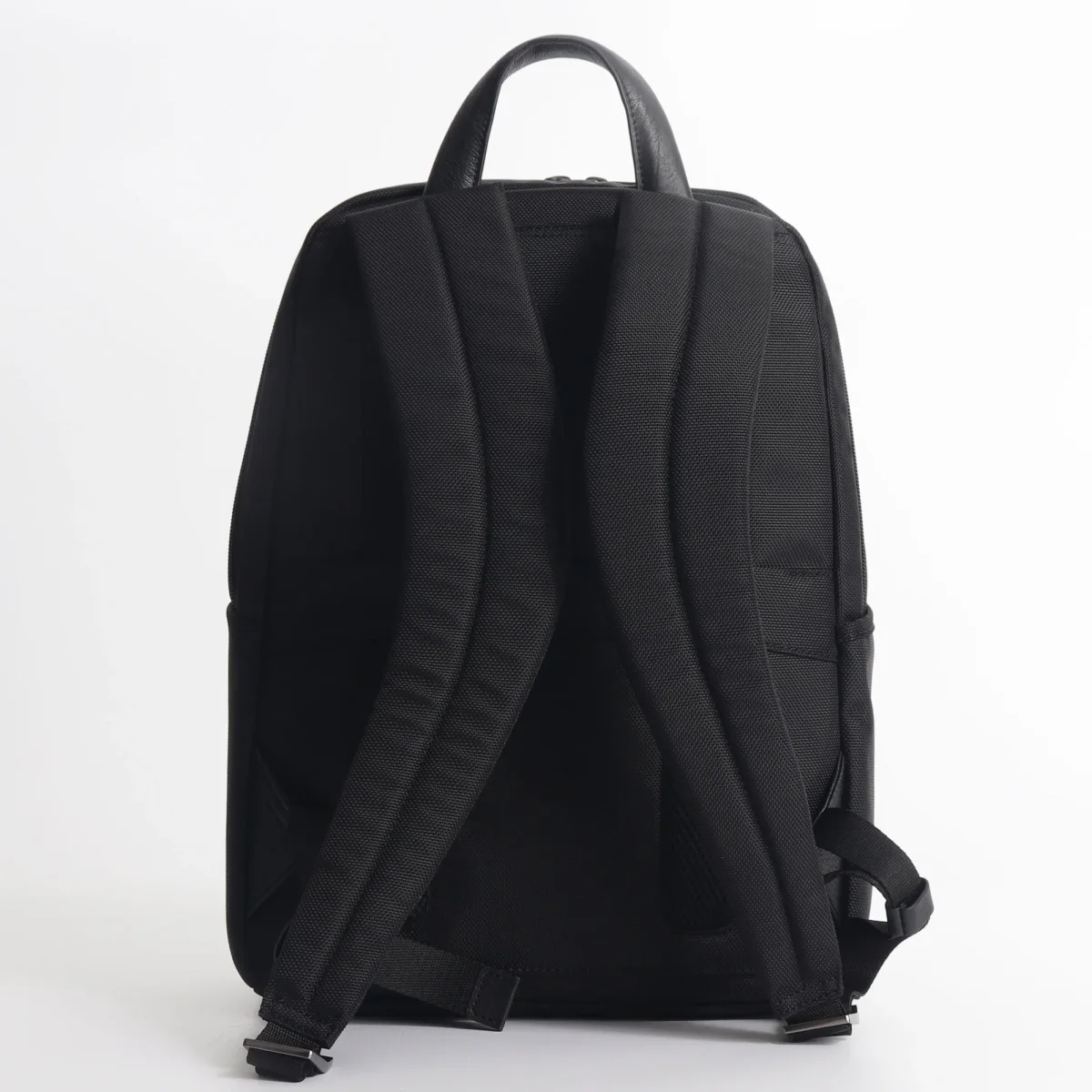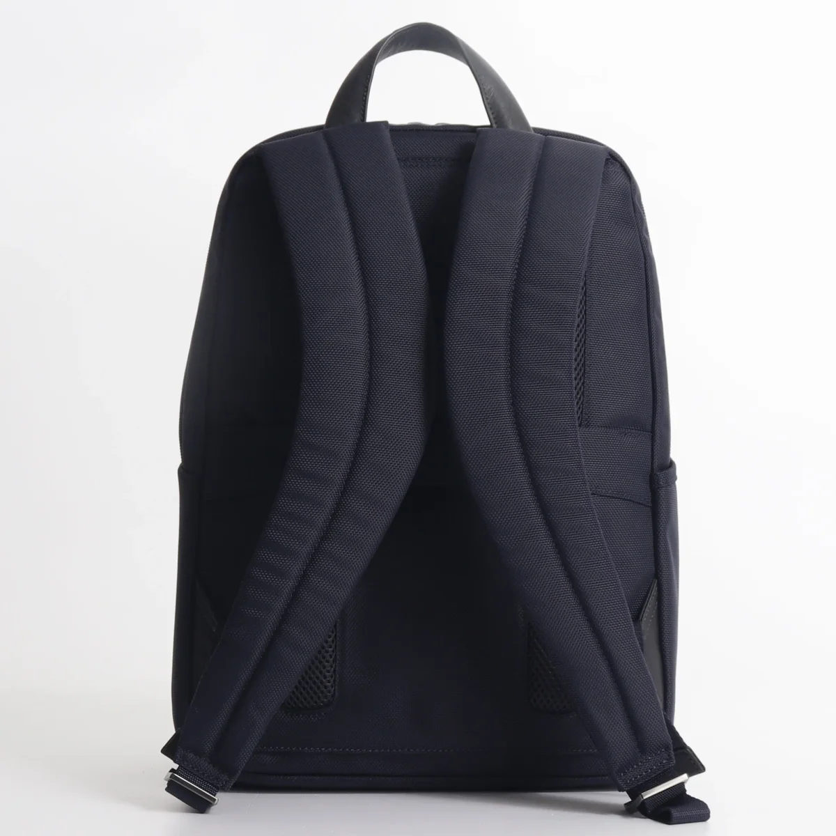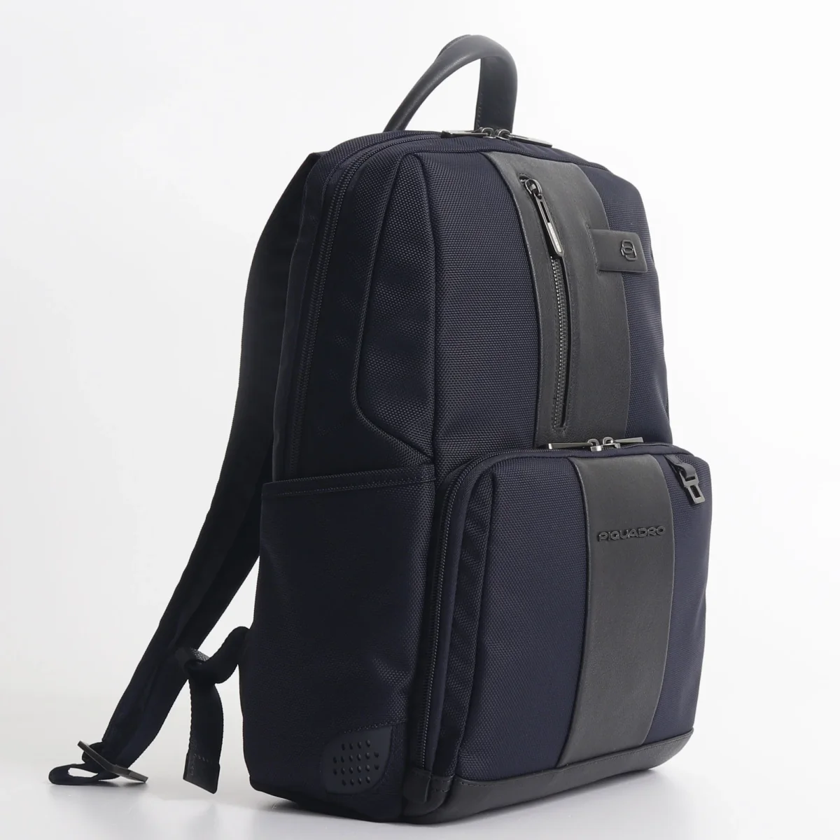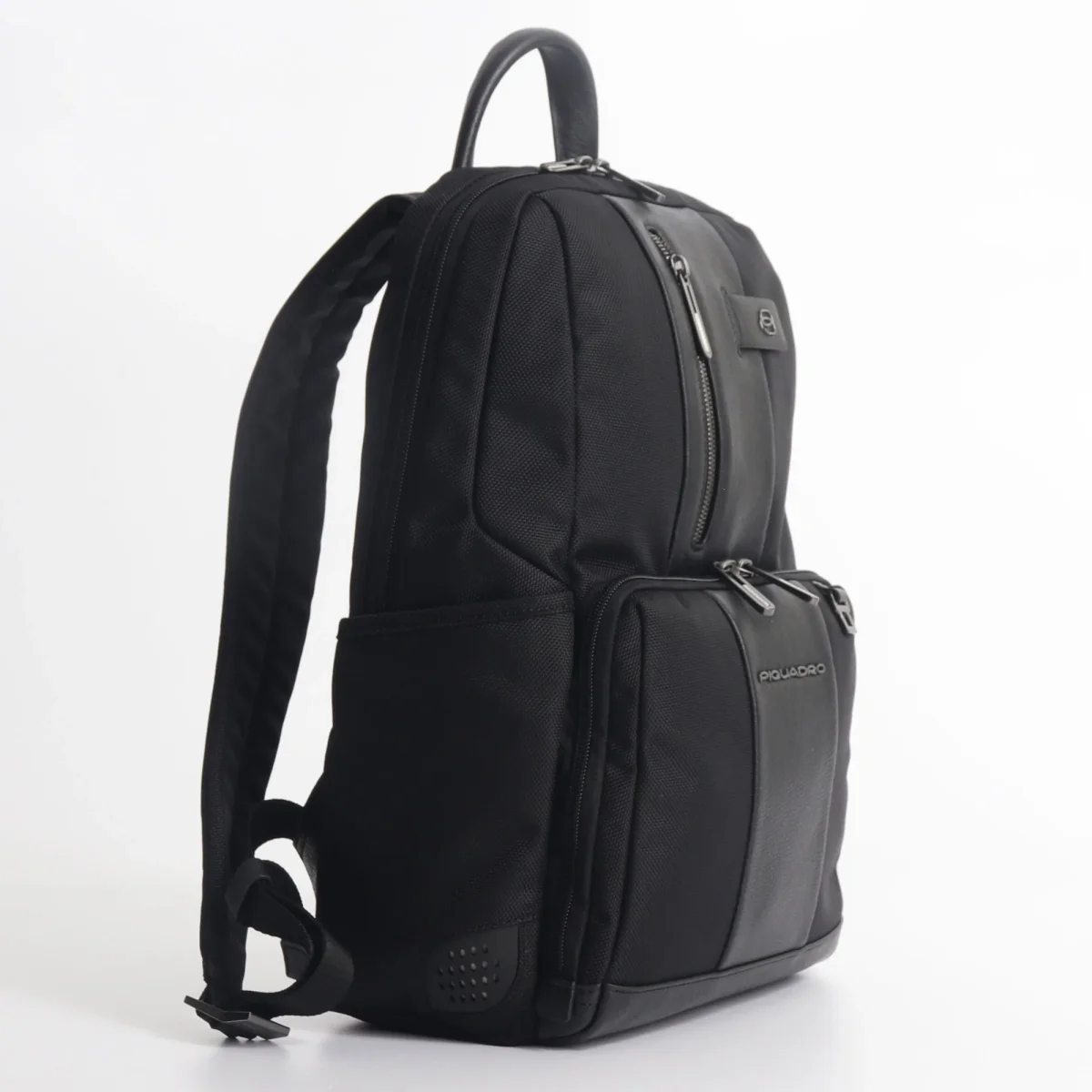 Zaino business Piquadro in tessuto tecnico proveniente da materiale riciclato proveniente da lavorazione sostenibile e dettagli in pelle, modello con scomparto porta computer fino a 14 pollici